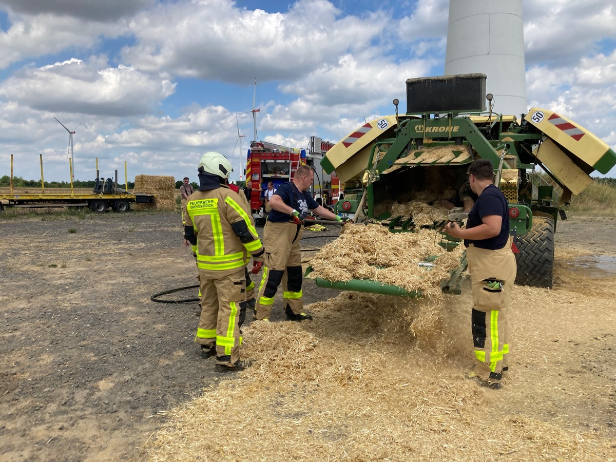 Die Feuerwehr konnte den Brandherd im Inneren der Ballenpresse mit zwei Schnellangriffsleitungen und einem Trupp unter Atemschutz schnell unter Kontrolle bringen. In Zusammenarbeit mit dem Eigentümer und dem 24-Stunden-Service der Herstellerfirma konnte ein Notentriegelungsventil der Hydraulik gezogen und die Maschine geöffnet werden. Aus der Presse entfernten die Einsatzkräfte daraufhin rund 300 Kilogramm gepresstes Stroh und löschten dieses ab.