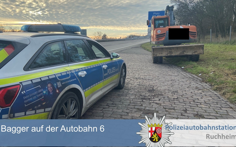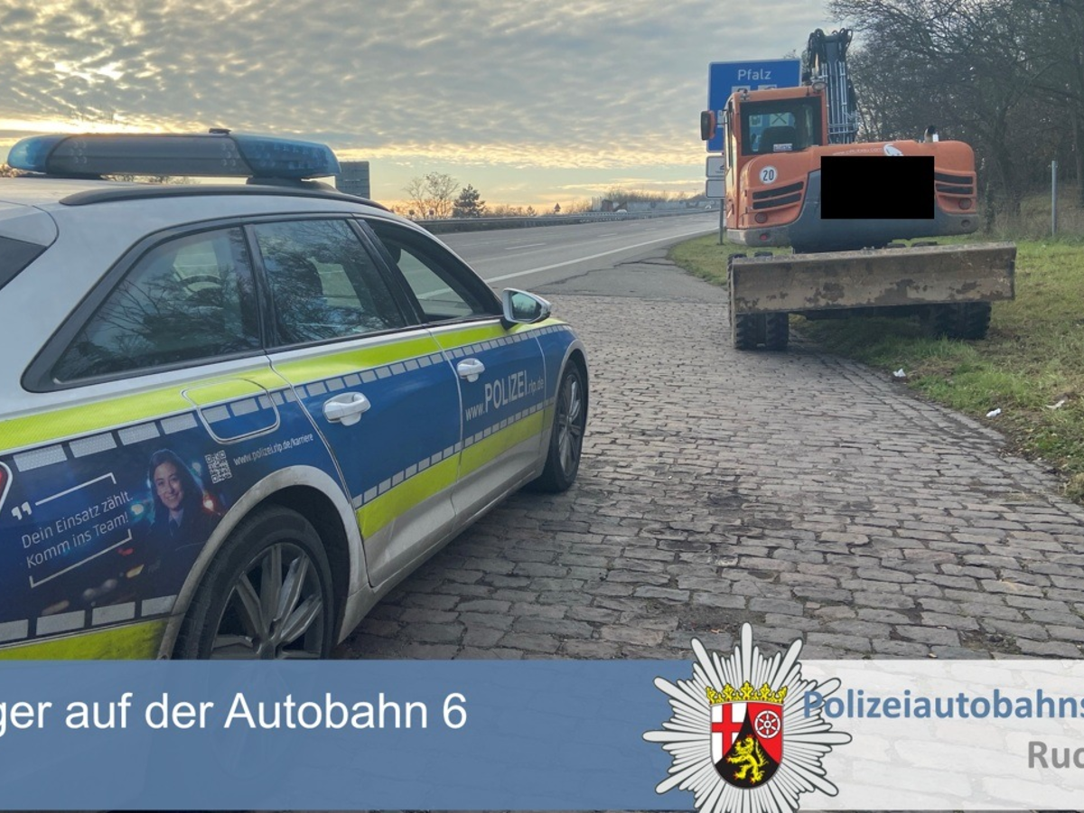 Grünstadt - Zu einem eher ungewöhnlichen Einsatz kam auf der Autobahn 6 bei Grünstadt für Beamte der Autobahnpolizei Ruchheim. Mehrere Verkehrsteilnehmer meldeten, dass ein großer Bagger auf der Autobahn in Richtung Kaiserslautern unterwegs sei. Besonders gefährlich war die Situation, da auf dem ohnehin unübersichtlichen Autobahnabschnitt am "Neuleininger Stich" kein Standstreifen vorhanden ist. Letztlich konnte der Bagger durch die Beamten festgestellt werden und in der Nothaltebucht bei Neuleiningen einer Kontrolle unterzogen werden. Der Fahrer, ein 47-jähriger Bauunternehmer aus dem Bereich Alzey, gab an, dass er sich in Grünstadt verfahren habe und versehentlich auf die Autobahn aufgefahren sei. Als ihm sein Fehler aufgefallen war, schienen ihm die Alternativen zu gefährlich zu sein, weswegen er seine Fahrt fortsetzte. Hinweise auf einen Alkohol- oder Drogenkonsum konnten bei dem Fahrer nicht festgestellt werden, allerdings ist der 47-Jährige nicht im Besitz einer Fahrerlaubnis, die ihn zum Führen des Baggers berechtigt. Zudem ist das Befahren der Autobahn mit dem Bagger nach § 18 StVO aufgrund der zu geringen erreichbaren Höchstgeschwindigkeit ohnehin nicht gestattet. Entsprechende Straf- und Ordnungswidrigkeitenverfahren wurden eingeleitet. Der Bagger wurde letztlich mittels eines Tiefladers von der Autobahn verbracht.