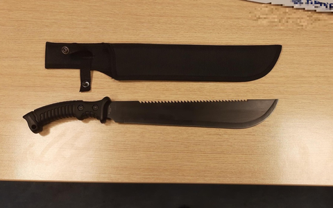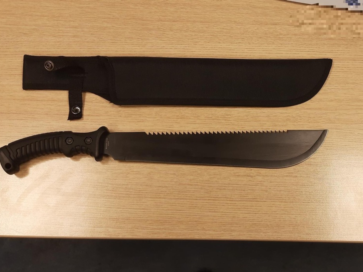 "Bei der Durchsuchung der Bekleidung nach Identitätspapieren entdeckten die eingesetzten Bundespolizisten im rechten Hosenbein eine Machete (Klingen-Länge 33 cm-siehe Foto). Der Macheten-Griff ragte zugriffsbereit aus dem Hosenbund heraus."