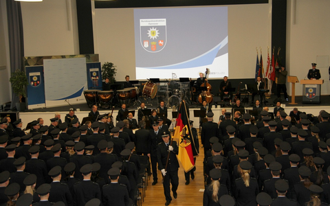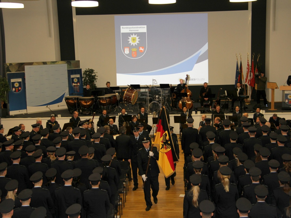 Musikalisch wurde der festliche Akt durch das Bundespolizeiorchester Hannover begleitet, das insbesondere mit seiner Interpretation von "Komet" (Udo Lindenberg x Apache 207) für Stimmung sorgte. Neben der Begrüßung des Präsidenten der Bundespolizeidirektion Hannover, Herrn Michael Schuol, richtete auch der Ratsherr und Bürgermeister der Landeshauptstadt Hannover, Herr Thomas Klapproth, wertschätzende Worte an die anwesenden Gäste der Veranstaltung. Hierbei betonte er, dass mit der Wahl des Polizeiberufs auch der Schutz der Demokratie einhergeht, welchem eine ganz besondere Bedeutung zukommt. Auch Oberpfarrer Derik Mennrich von der Evangelischen Bundespolizeiseelsorge richtete Willkommensgrüße an die neuen Mitarbeitenden.