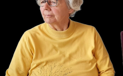 Sie ist bekleidet mit einem grauen Pullover, einer dunklen Hose und grünen Hausschuhen.