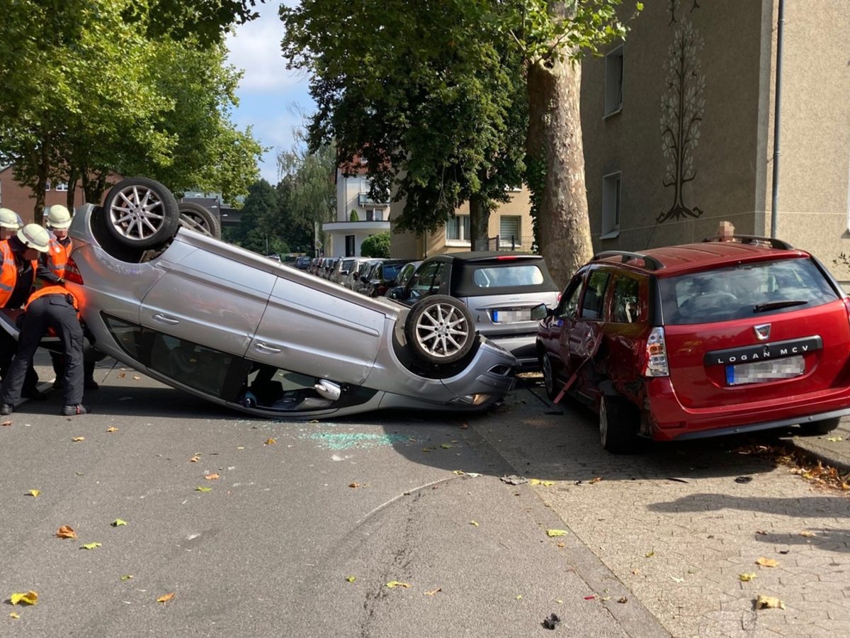 Durch die Wucht des Aufpralls überschlug sich die B-Klasse und landete auf dem Dach. Durch das beherzte Eingreifen von Ersthelfern konnte die 67-Jährige noch vor Eintreffen der Rettungskräfte aus dem Auto befreit werden. Die Erkratherin erlitt glücklicherweise nur leichte Verletzungen und wurde zur ambulanten Behandlung in ein Krankenhaus gebracht. Es entstand ein Gesamtschaden an allen drei Autos in fünfstelliger Höhe. Die B-Klasse sowie der Dacia waren nicht mehr fahrbereit und wurden abgeschleppt.