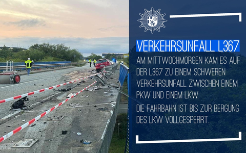 Die L367 ist im Abschnitt zwischen Weilerbach und KL-Siegelbach seit dem Unfall gesperrt. Wegen der Bergung des Lkw wird die Sperrung voraussichtlich noch mehrere Stunden andauern. |cri