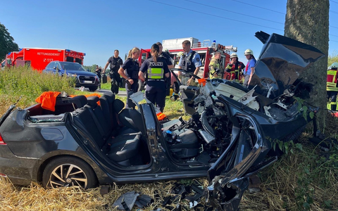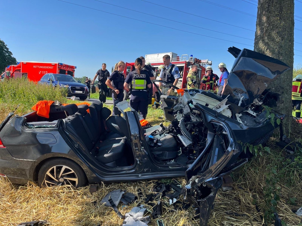 Kalkar - Um 9:57 Uhr am 15.07.2024 wurden der Löschzug Kalkar Mitte sowie die Löschgruppen Appeldorn, Hönnepel und Niedermörmter zu einem Verkehrsunfall auf der Obermörmterer Straße in Niedermörmter alarmiert. Ein PKW war frontal gegen einen Baum geprallt. Durch die Wucht des Aufpralls wurde der Motorblock aus dem Fahrzeug geschleudert und der Fahrer erlitt schwere Verletzungen. Für die patientenorientierte Rettung wurde das Dach des Fahrzeugs entfernt. Der Patient wurde an den Rettungsdienst übergeben und anschließend mit einem Rettungshubschrauber in ein Krankenhaus transportiert. Da zu Beginn unklar war, ob sich noch weitere Personen im Fahrzeug befanden, wurde eine Drohne angefordert. Bis zu deren Eintreffen durchsuchte die Feuerwehr das umliegende Feld. Es wurden keine weiteren Personen im Fahrzeug gefunden. Neben der Sicherstellung des Brandschutzes wurden auslaufende Betriebsstoffe aufgenommen. Unter der Einsatzleitung von Roland Matenaer waren 25 Feuerwehrleute über 1,5 Stunden im Einsatz. Die Polizei wurde bei der Unfallaufnahme unterstützt. Zur Unfallursache oder zur Höhe des Schadens können keine Angaben gemacht werden. Wie wir aus der Pressemitteilung der Polizei erfahren haben, ist der Fahrer des PKWs verstorben. Unser Mitgefühl gilt den Angehörigen.