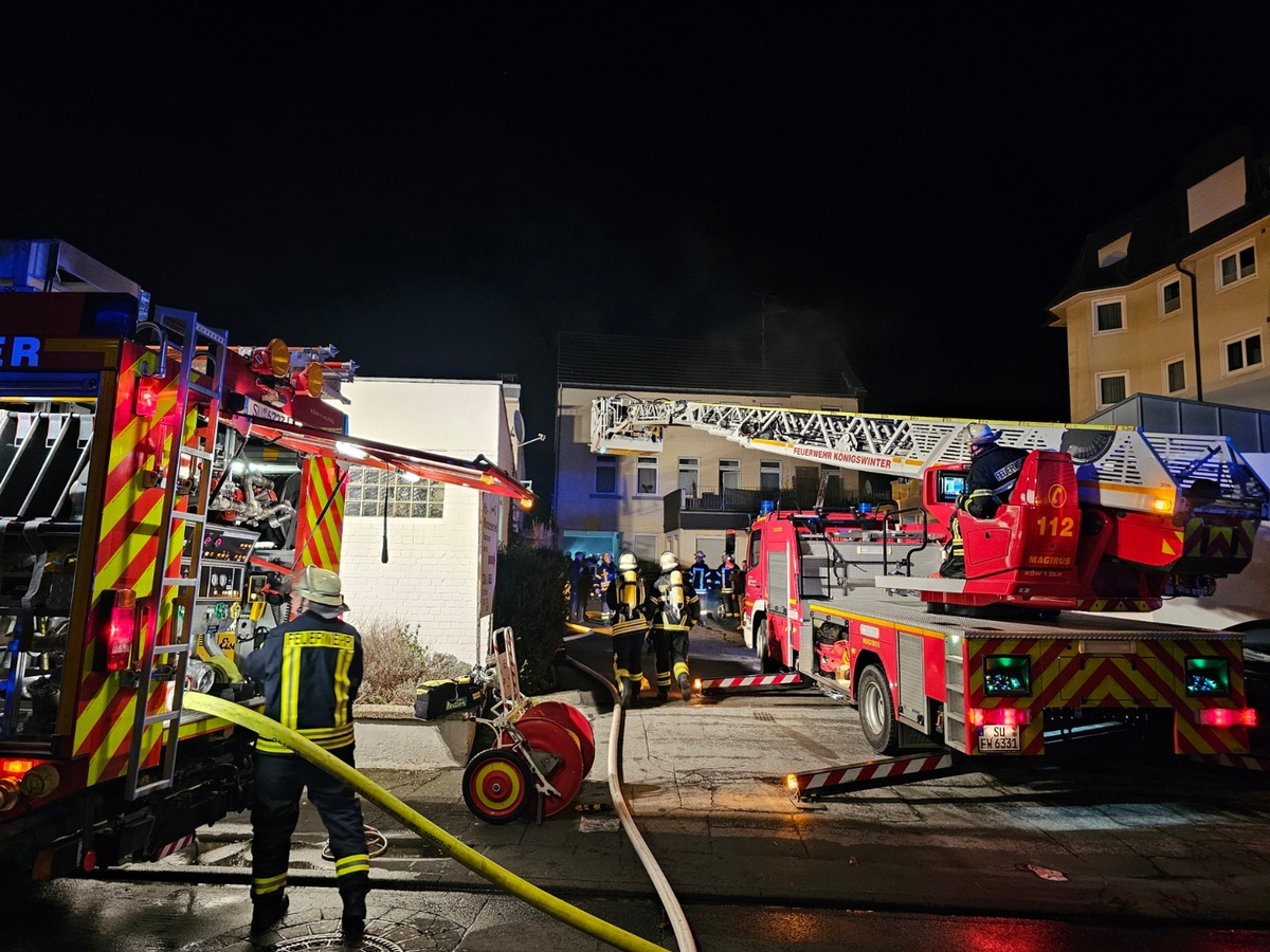 Um 04:38 Uhr am frühen Samstagmorgen wurde die Freiwillige Feuerwehr Königswinter mit dem Einsatzstichwort "B3-M", Feuer mit Menschenleben in Gefahr, in die Hauptstraße alarmiert. Bei Eintreffen der ersten Kräfte stand eine Wohnung in enger Bebauung in Vollbrand. Flammen schlugen aus den Räumen. Vor dem Gebäude geparkte PKW hatten bereits Feuer gefangen. Es drohte eine akute Brandausbreitung auf weitere Gebäudeteile. Mehrere Menschen wurden in dieser Einsatzphase im stark verrauchten Gebäude vermisst. Zwei Bewohner hatten sich auf ein nebenstehendes Gebäude gerettet. Über eine Steckleiter und eine Drehleiter wurden diese zwei Personen und ein Hund von einem Flachdach gerettet. Zur Durchsuchung des Gebäudes und zur Brandbekämpfung wurden in Spitzenzeiten bis zu neun Atemschutztrupps gleichzeitig eingesetzt. Über die Drehleiter und mit mehreren Strahlrohren wurde das Feuer bekämpft. Nach dem Ablöschen der Flammen fanden Einsatzkräfte eine leblose Person im Erdgeschoß des betroffenen Gebäudeanbaus. Für diesen Menschen kam jede Hilfe zu spät. Weitere Personen wurden nicht angetroffen. Das L-förmige Gebäude in zweiter Baureihe ist stark beschädigt. Rauch war auch in das Haupthaus gezogen. Für die Löschmaßnahmen wurden weitere Kräfte benötigt. Rund 25 Minuten nach der ersten Alarmierung rückten Kräfte aus Ittenbach mit Atemschutzgeräteträgern nach. Die Nachlöscharbeiten sind sehr aufwendig und laufen zum aktuellen Zeitpunkt weiter. Es kam zu einer erneuten Durchzündung im Anbau. Von der Rückseite wurde die Außenfassade demontiert. Der Löschzug Oelberg und der Löschzug Bad Honnef unterstützte im weiteren Einsatzverlauf mit zusätzlichen Kräften. Über die Drehleiter werden auf der Rückseite der Bebauung Dachteile geöffnet. Die Drehleiter der Feuerwehr Bad Honnef stand vor dem Gebäude bereit. Zur Koordinierung der Maßnahmen wurden drei Einsatzabschnitte gebildet. Austausch-Atemschutzgeräte wurden über den Rhein-Sieg-Kreis an die Einsatzstelle gebracht. Die Versorgungseinheit des DRK stellt zurzeit warme Getränke zur Verfügung. Zur Absicherung der Einsatzkräfte und Versorgung von Verletzten war der Rettungsdienst mit drei Rettungswagen und einem Notarzt vor Ort. Bewohner werden vom städtischen Ordnungsamt in einem Hotel untergebracht. Alle Gebäudeteile sind unbewohnbar. Für den ausgebrannten Teil besteht Einsturzgefahr. Die Kriminalpolizei hat vor Ort die Ermittlungen zur Brandursache mit Todesfolge aufgenommen. Die Hauptstraße, sowie die Rheinallee und Steinmetzstraße sind teilweise gesperrt. Für mögliche Paralleleinsätze stand die Löschgruppe Bockeroth und die Löschgruppe Rhöndorf (Freiwillige Feuerwehr Bad Honnef) am Gerätehaus in der Altstadt bereit. Aktuell verlassen erste Einheiten die Einsatzstelle. Die Nachlöscharbeiten dauern weiter an.