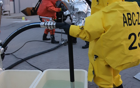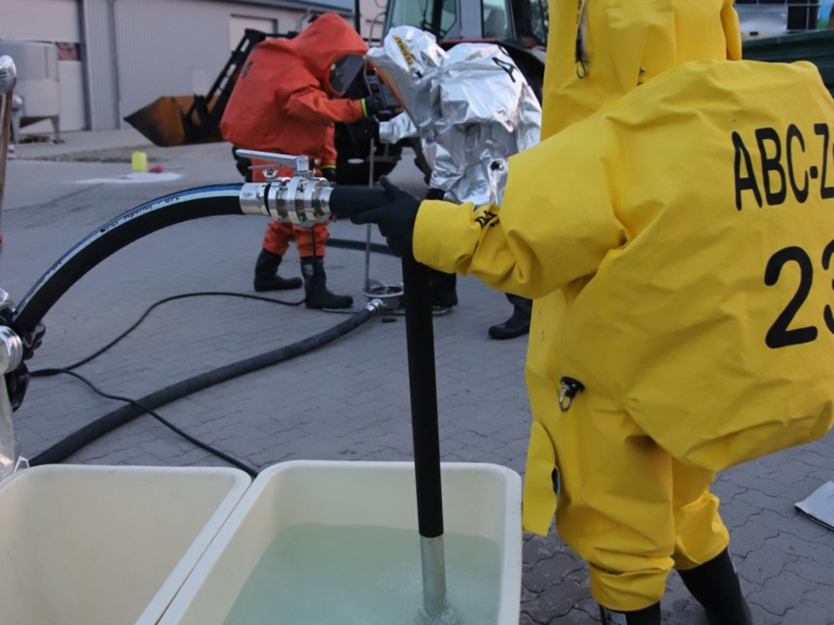 Nach Rücksprache mit der Einsatzleitung sollte das kontaminierte Fass in ein Überfass mit Aktivkohlefilter umgelagert werden. So wurde verhindert, dass giftige Gase an die Außenluft gelangen konnten.