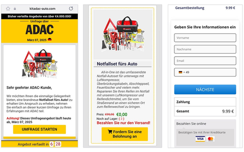 Auf der gefälschten Webseite wird man gebeten, acht Fragen zu beantworten, in denen es um die Dienstleistungen des ADAC geht. Der einzige Zweck dieser Umfrage ist, eine gewisse Seriosität vorzugaukeln. Damit man nicht so lange nachdenkt, tickt unten eine Uhr sechs Minuten und dreißig Sekunden herunter. Wenn diese Zeit abgelaufen ist, geht der Timer jedoch selbstverständlich von vorne los. Der vorgegaukelte Zeitablauf soll Handlungsdruck erzeugen. Die Betroffenen sollen am Ende dazu verleitet werden, persönliche Daten und Bankverbindungen einzugeben. Sobald die Kriminellen diese Informationen haben, können sie diese nutzen, um Identitätsdiebstahl zu begehen oder finanzielle Schäden anzurichten.