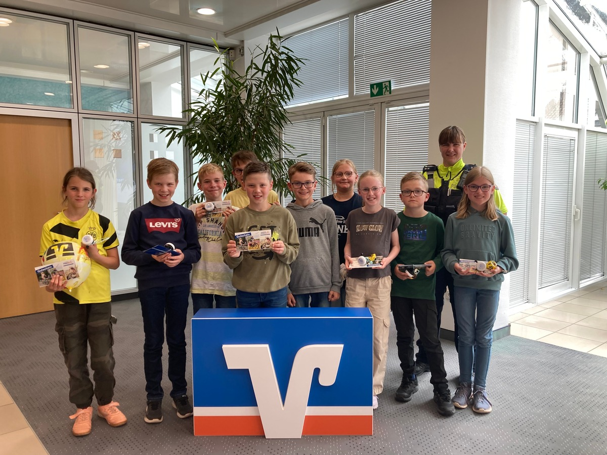 Marsberg - Immer wieder besuchen die Verkehrssicherheitsberater und Verkehrssicherheitsberaterinnen der Polizei die Grundschulen im HSK. Auf dem Stundenplan der Kinder steht dann die Verkehrserziehung. Dabei werden die Viertklässler auf das Fahrradfahren im Straßenverkehr vorbereitet. Mit der Unterstützung von Polizeioberkommissarin Claudia Becker haben die Marsberger Kinder ihr Fahrrad verkehrssicher gemacht und sich eine Plakette als Auszeichnung verdient. Wer eine Plakette bekommen hat, durfte an der Aktion "Verkehrssicheres Fahrrad" teilnehmen. In Zusammenarbeit mit der Volksbank Marsberg wurden 10 Kinder als Preisträger ermittelt und zur Preisverleihung eingeladen. Sie durften sich über eine Fahrradklingel und einen Gutschein von Zweirad Albers freuen.