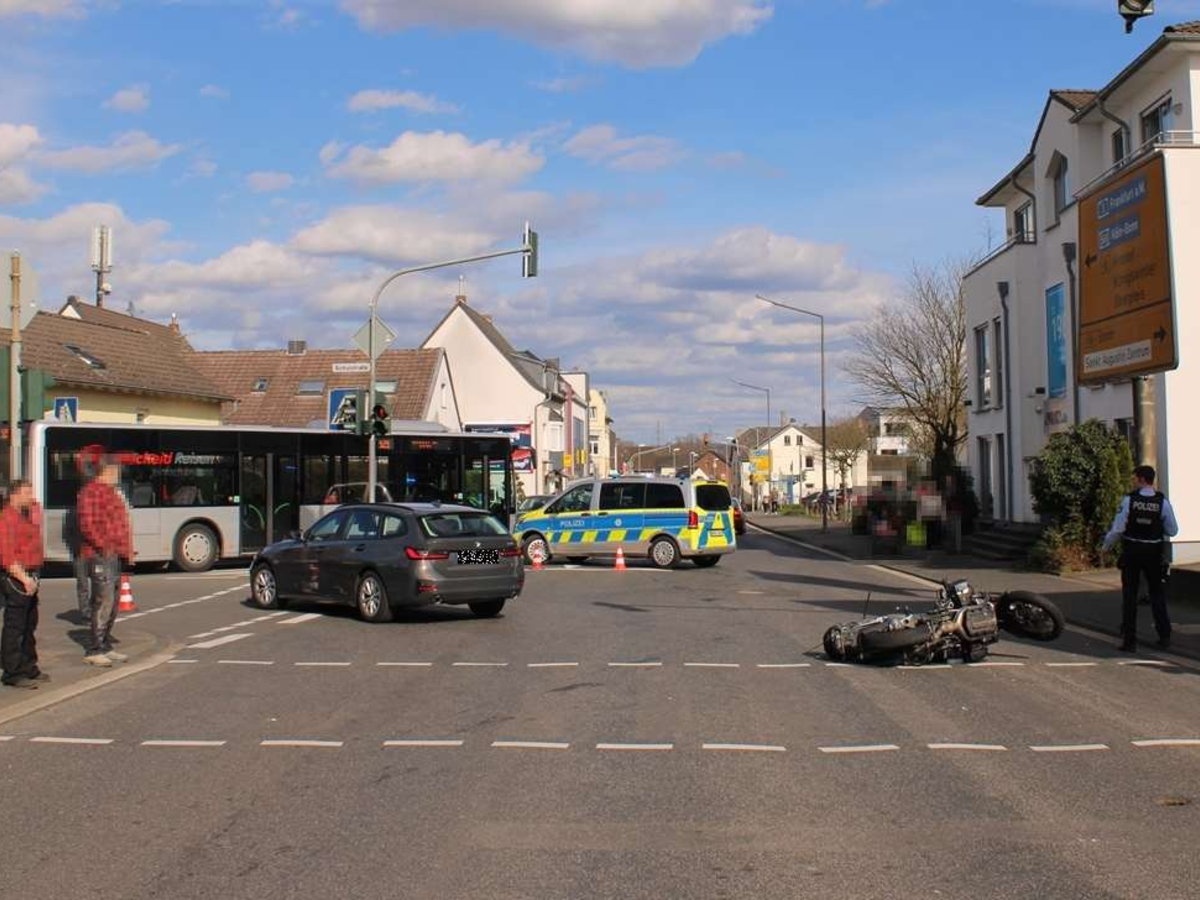 Der Fahrer eines BMW-Motorrades befuhr gegen 14.45 Uhr die Hauptstraße in Sankt Augustin-Niederpleis geradeaus in Fahrtrichtung Ortsmitte. Ihm kam ein BMW-Kombi entgegen, dessen 54-jĂ€hrige Fahrerin bei GrĂŒnlicht zeigender Ampelanlage nach links in die Schulstraße abbog. Der bevorrechtigte 69-JĂ€hrige prallte mit der schweren BMW in die Seite des abbiegenden Autos und stĂŒtzte. Er zog sich leichte Verletzungen zu, die durch den Rettungsdienst zunĂ€chst vor Ort versorgt wurden.