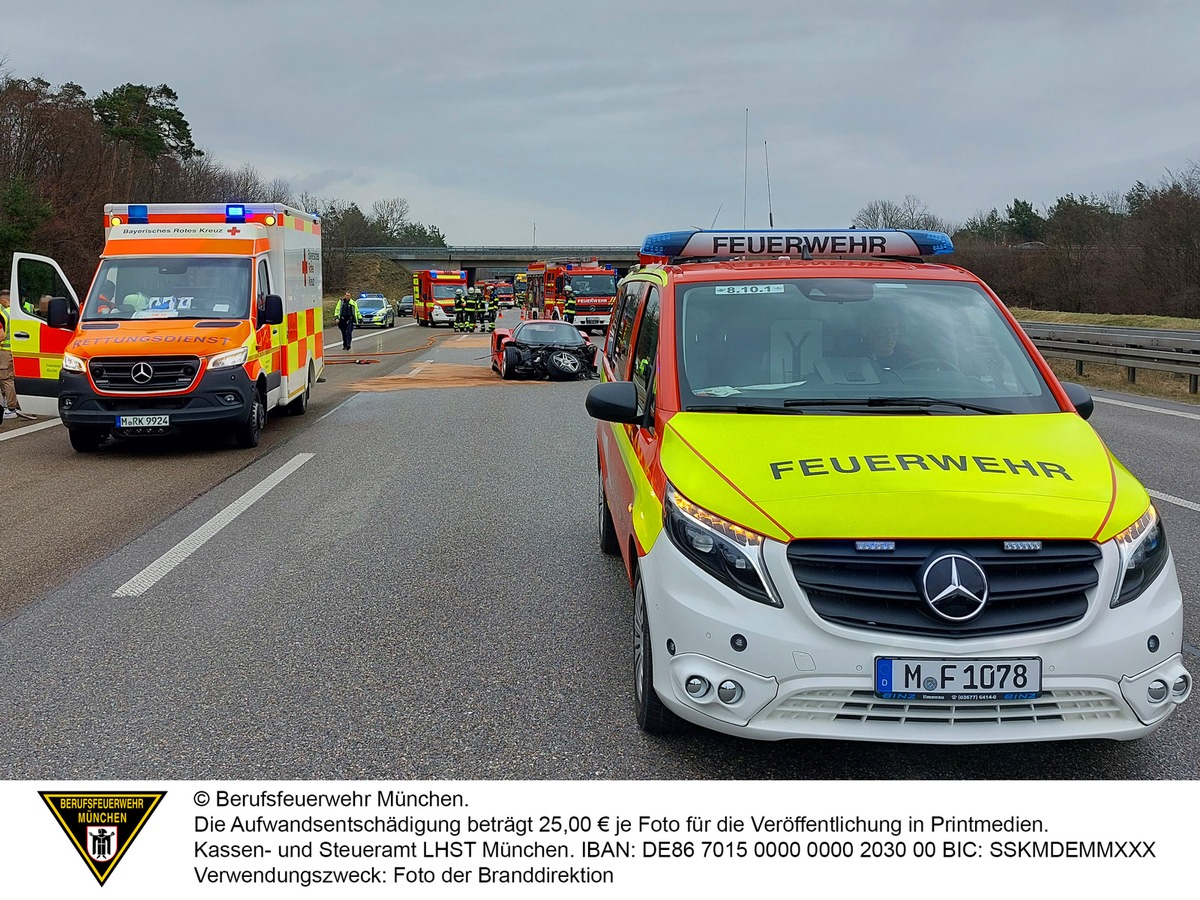 Drei Personen wurden bei dem Verkehrsunfall verletzt, eine Person musste in eine MĂŒnchner Klinik transportiert werden. EinsatzkrĂ€fte der Feuerwehr sicherten die Unfallstelle ab und nahmen auslaufende Betriebsstoffe auf. Die TrĂŒmmer des Wracks waren auf rund 200 Metern verteilt und mussten beseitigt werden.