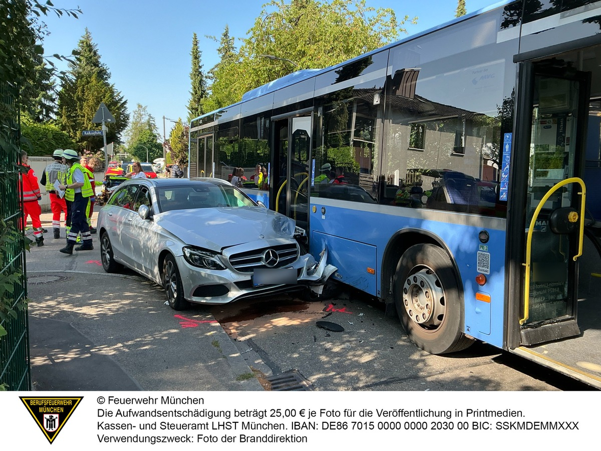 Aufgrund der ersten Schilderungen über den Zusammenstoß der beiden Fahrzeuge im Kreuzungsbereich in einer Wohnsiedlung alarmierte die Leitstelle München zunächst einige Fahrzeuge des Rettungsdienstes zur gemeldeten Örtlichkeit. Da zu Beginn von mehreren Verletzten ausgegangen werden musste und sich den ersten Kräften ein sehr unübersichtliches Bild bot, wurde die Alarmstufe erhöht und die Feuerwehr mit einem Rüstzug sowie Unterstützungseinheiten hinzugezogen. Die Kindergartenkinder im Alter von 5 und 6 Jahren, die weiteren sieben Erwachsenen im Bus sowie die Fahrerin des Pkw, die allein in ihrem Mercedes unterwegs war, konnten alle selbstständig aus den Fahrzeugen steigen. Sie wurden umgehend durch die Einsatzkräfte betreut und gesichtet. Nachdem mehrere Personen vor Ort ambulant versorgt wurden, mussten schlussendlich ein Kind und drei Erwachsene in Münchner Krankenhäuser transportiert werden, darunter auch die Pkw-Lenkerin. Allesamt wurden aber nicht schwer verletzt. Zur Betreuung der unverletzten Kinder wurde der Großraumrettungswagen der Berufsfeuerwehr und das Kriseninterventionsteam hinzugezogen. Anschließend konnten die Kinder Großteiles an ihre Eltern übergeben werden oder wurden zurück in den Kindergarten gebracht.