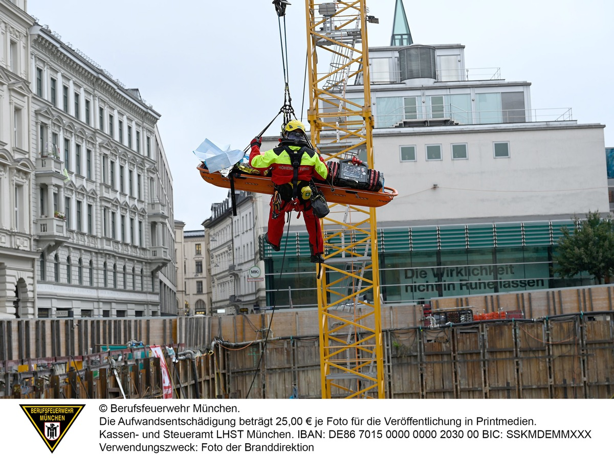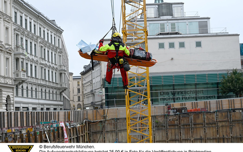 Der schwerverletzte Arbeiter wurde in der Baugrube von den Einsatzkräften versorgt und stabilisiert. Anschließend brachten ihn die Höhenrettern der Berufsfeuerwehr München mit einer Schleifkorbtrage nach oben. Er wurde in den Schockraum einer Münchner Klinik eingeliefert.