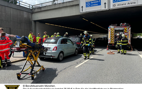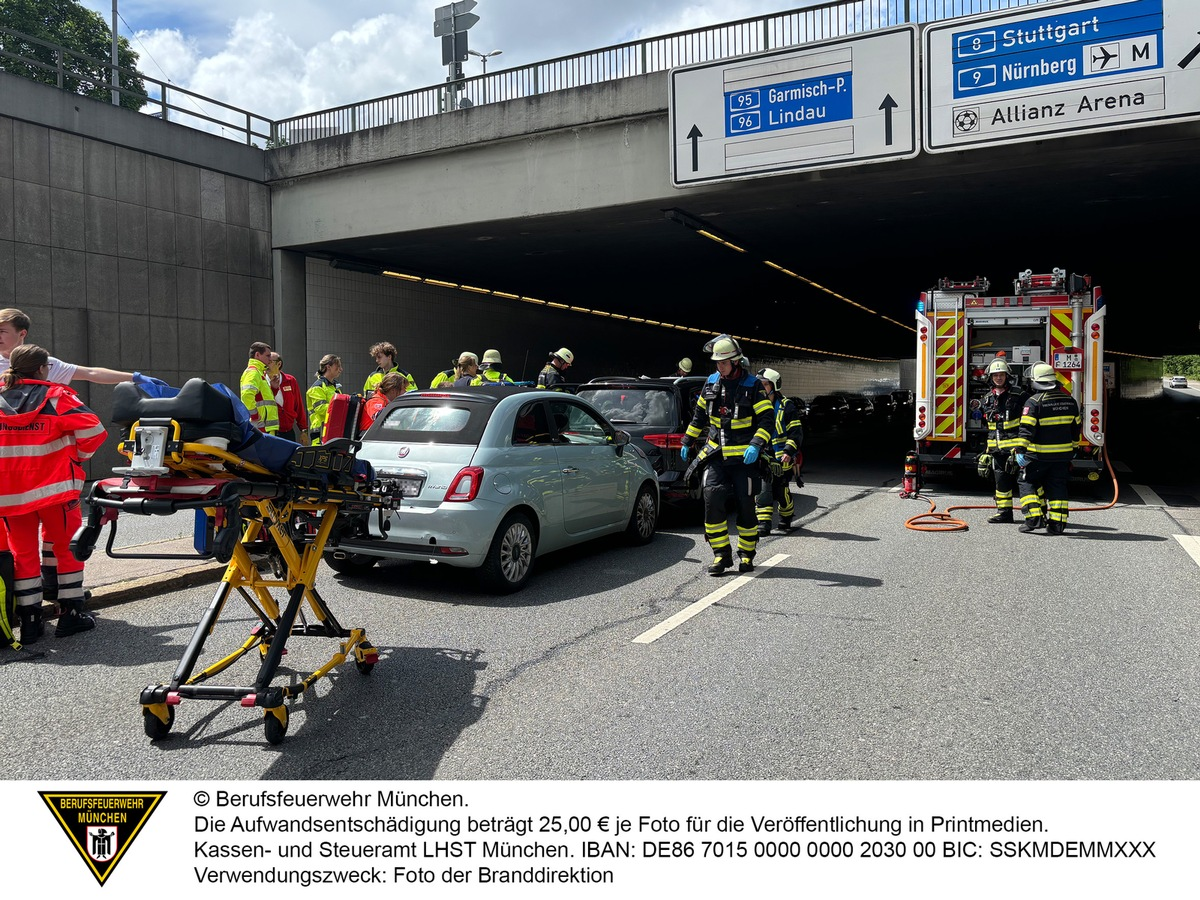 Gegen 13:55 Uhr wurden die Einsatzkräfte der Feuerwehr München zu einem Verkehrsunfall auf dem Mittleren Ring alarmiert. Auf Höhe der Unterführung Schenkeldorfstraße war es zu einem Auffahrunfall mit drei Pkw gekommen. Nach dem Absichern der Einsatzstelle wurde durch die Feuerwehr der Brandschutz sichergestellt und Sicherungsmaßnahmen an den Fahrzeugen durchgeführt. Eine 56-jährige und eine 70-jährige Frau wurden nach Abstimmung mit dem Einsatzleiter Rettungsdienst in Münchner Kliniken transportiert. Die Feuerwehr übernahm die Betreuung eines unverletzten Kindes bis zum Eintreffen der Eltern.