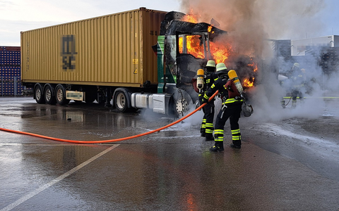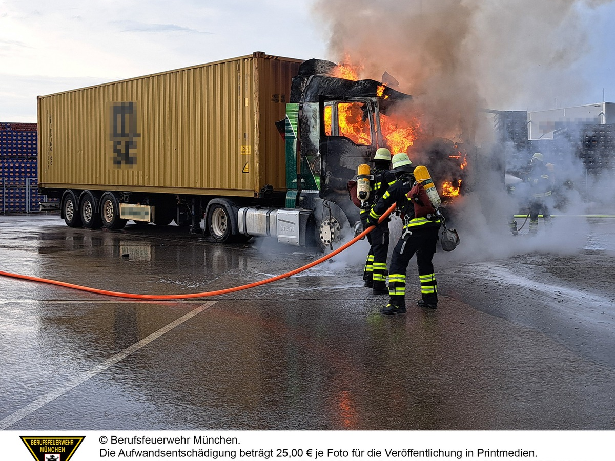 Gegen 17 Uhr wurden Einsatzkräfte der Feuerwehr München zu einem brennenden Lkw nach Langwied alarmiert. Bereits auf der Anfahrt war eine große Rauchsäule sichtbar. An der Einsatzstelle wurden sofort Löschmaßnahmen eingeleitet und der schwer verletzte 50-jährige Fahrer erstversorgt. Dieser hatte noch Löschversuche unternommen und sich dabei schwere Verbrennungen im Bereich des Oberkörpers zugezogen. Trotzdem konnte er eine Brandausbreitung auf die Kabine des Lkw nicht verhindern. Zwei Atemschutztrupps löschten den Brand mit drei Hohlstrahlrohren und Löschschaum. Die Fahrerkabine wurde durch den Brand komplett zerstört.