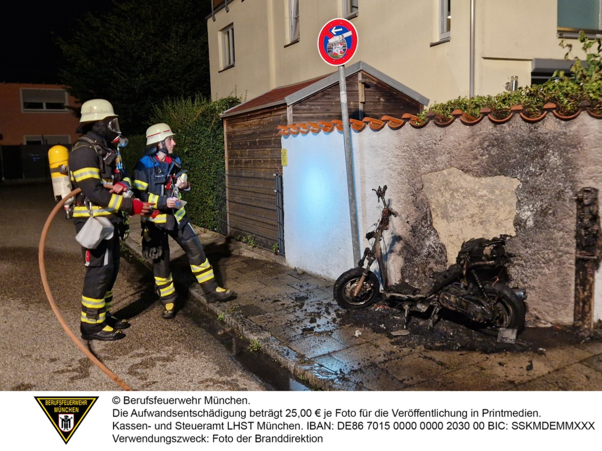 Mehrere Personen meldeten dichten Rauch und meterhohe Flammen in der Haunerstraße. Als die ersten Einsatzkräfte der Feuerwehr München an der gemeldeten Adresse eintrafen, stand ein Motorroller bereits in Vollbrand. Ein Atemschutztrupp begann sofort mit der Brandbekämpfung. Mit einem Hohlstrahlrohr konnte ein Übergreifen der Flammen auf den Garten verhindert werden. Am brennenden Roller entstand Totalschaden.
