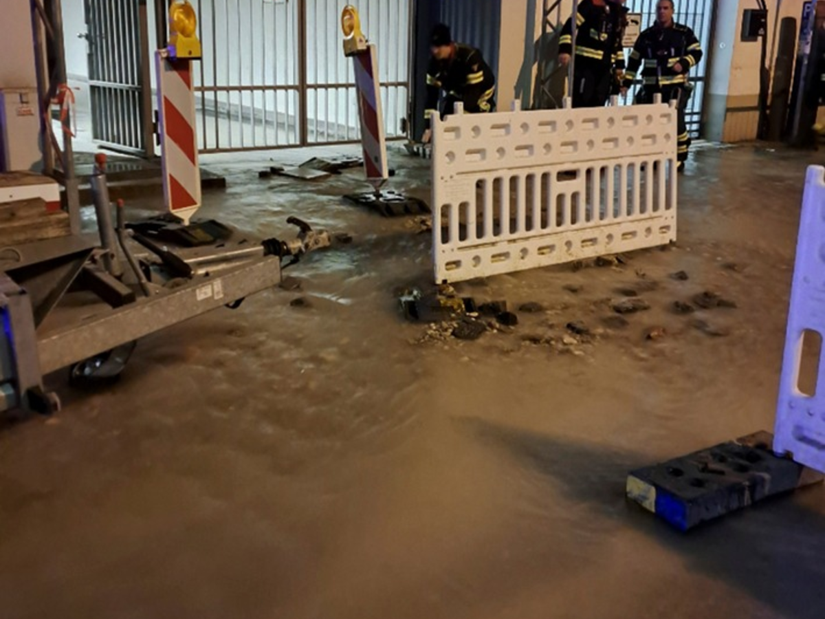 Das Wasser verteilte sich großflächig auf der Landwehrstraße und lief über eine Abfahrt in eine Tiefgarage und in die angrenzenden Kellerräume. Im Keller des betroffenen Anwesens stand das Wasser knietief. Für die Besatzung des Kleinalarmfahrzeuges war schnell klar, dass die mitgeführte Pumpe nicht ausreichen würde, um den Wassermassen Herr zu werden. Sie alarmierten weitere Kräfte nach.