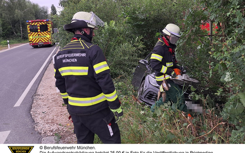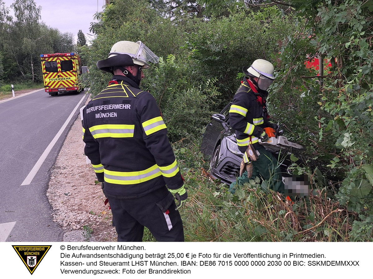 Die Meldung "Person eingeklemmt" bestätigte sich glücklicherweise nicht. Der 24-Jährige hatte bei Eintreffen sein Auto bereits verlassen. Die Besatzung eines Rettungswagens versorgten den Fahrer des Fahrzeuges und transportierten in anschließend mit leichten Verletzungen in eine Münchner Klinik. Die Einsatzkräfte der Feuerwehr mussten zur Sicherung des Fahrzeuges und zur Kontrolle einer Elektroverteilung teilweise kleinere Bäume und Büsche entfernen. Die Elektroverteilung nahm glücklicherweise keinen Schaden.