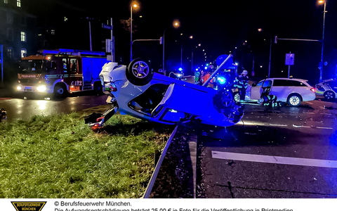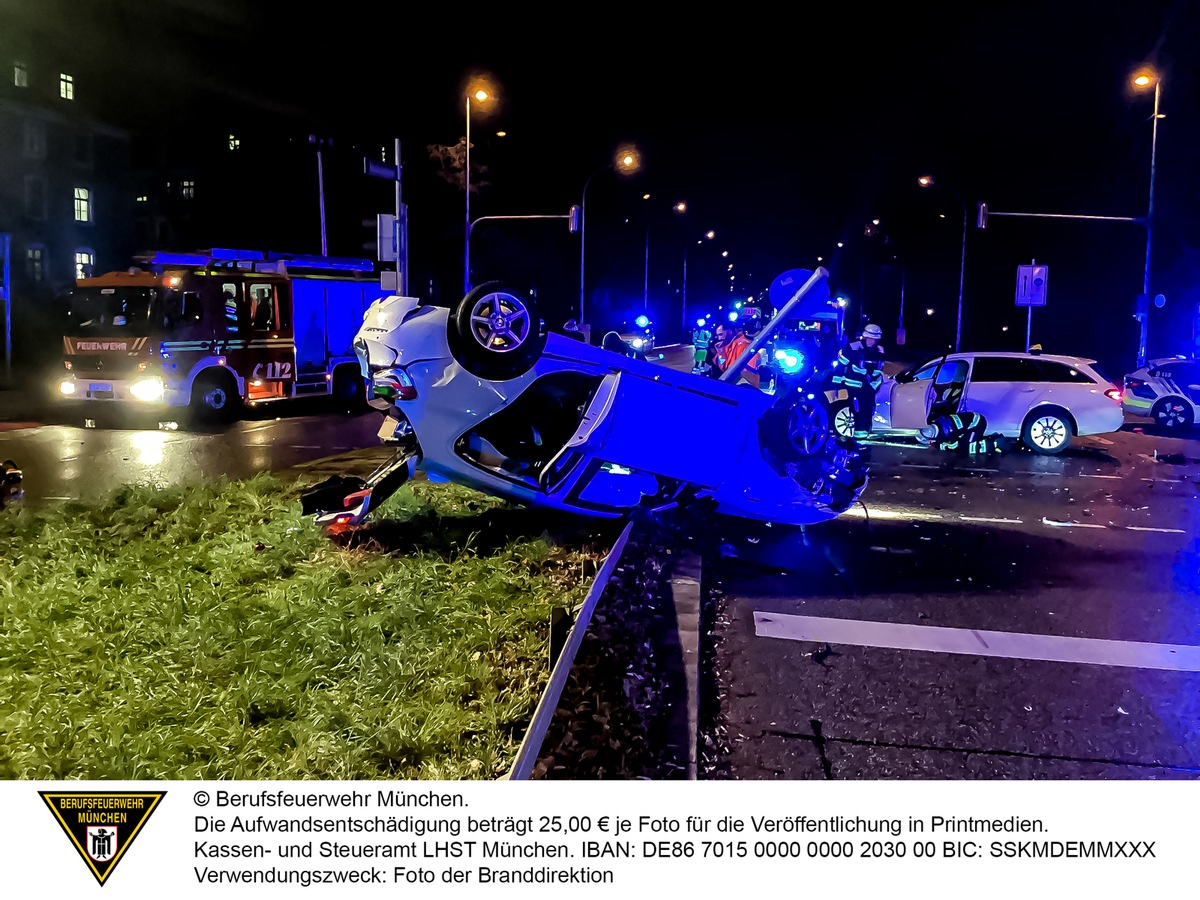 Bei Eintreffen der Feuerwehr lag ein BMW auf dem Dach und ein bewusstloser Mann war im Inneren zu sehen. Die Einsatzkräfte öffneten mit hydraulischem Gerät eine Türe des Fahrzeuges und führten eine Crashrettung des Fahrers durch. Der 35-Jährige wurde nach einer Erstversorgung zur weiteren medizinischen Behandlung in den Schockraum einer Münchner Klinik transportiert.