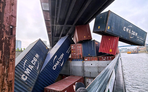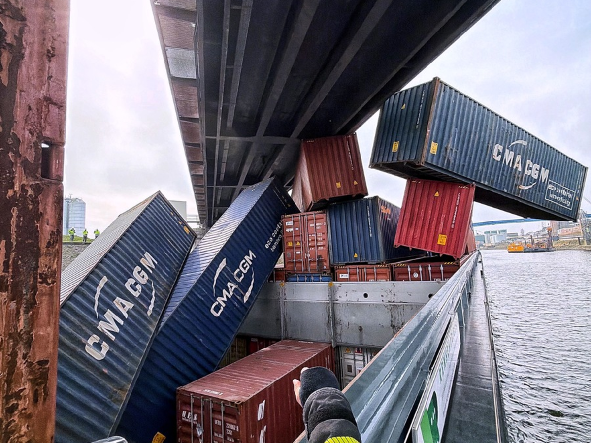 FW-NE: Containerschiff kollidiert mit Brücke | Container stürzen ins Wasser