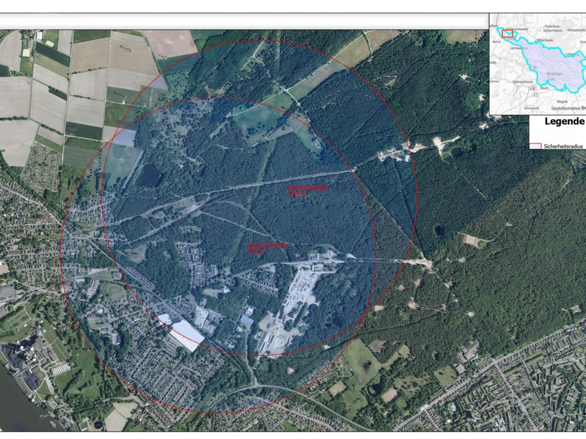 Bremen - Bei Sondierungsarbeiten im ehemaligen Tanklager Farge wurden zwei verdĂ€chtige GegenstĂ€nde entdeckt, bei denen es sich sehr wahrscheinlich um zwei BombenblindgĂ€nger aus dem zweiten Weltkrieg handelt. Die EntschĂ€rfung ist fĂŒr kommenden Sonntag, 26. April, geplant. Alle Anwohner im Evakuierungsradius mĂŒssen dazu um 8 Uhr ihre Wohnungen verlassen.