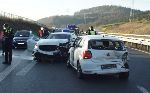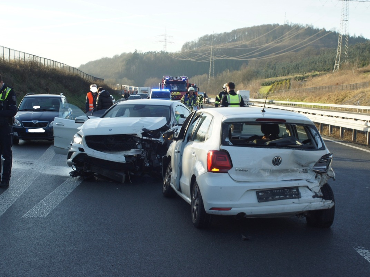 Olsberg - Ein 23-jähriger aus Meschede war am Freitagnachmittag gegen 14:20 Uhr mit 3 Freunden und einer Freundin, alle im Alter zwischen 16 und 17 Jahren, mit seinem Mercedes CLA auf der Autobahn 46 in Richtung Olsberg auf der linken Fahrspur unterwegs. Kurz nach der Auffahrt Velmede fuhr er aus bisher noch ungeklärter Ursache auf einen vor ihm fahrenden VW Polo auf. Beide Fahrzeuge sind hierbei ins Schleudern geraten und touchierten einen auf der rechten Spur fahrenden Skoda Fabia eines 74-jährigen Olsbergers. Die 28-jährige Fahrerin des VW sowie ihre 6-jährige Tochter blieben hierbei unverletzt. Der 74-jährige Olsberger, sowie die drei Insassen des Mercedes von der Rückbank blieben ebenfalls unverletzt. Die 74-jährige Beifahrerin des Olsbergers, sowie der Fahrer und Beifahrer des Mercedes wurden nach notärztlicher Untersuchung vor Ort zur Kontrolle in naheliegende Krankenhäuser transportiert. Die BAB 46 war bis etwa 15:25 Uhr in Richtung Olsberg ab der Auffahrt Velmede voll gesperrt. Nachdem die sieben Einsatzkräfte des Löschzuges Bigge-Olsberg, die mit 2 Fahrzeugen vor Ort waren, die linke Fahrspur von Trümmerteilen und Glasscherben befreit hatten, konnte der Verkehr an der Unfallstelle vorbeigeleitet werden. Nachdem ein Abschleppunternehmen alle drei Fahrzeuge aufgeladen hatte, konnte die Fahrbahn dann abschließend gereinigt und um 16:35 Uhr von der Polizei wieder freigegeben werden. Einsatzende war für die Feuerwehr Olsberg um 17:00 Uhr.