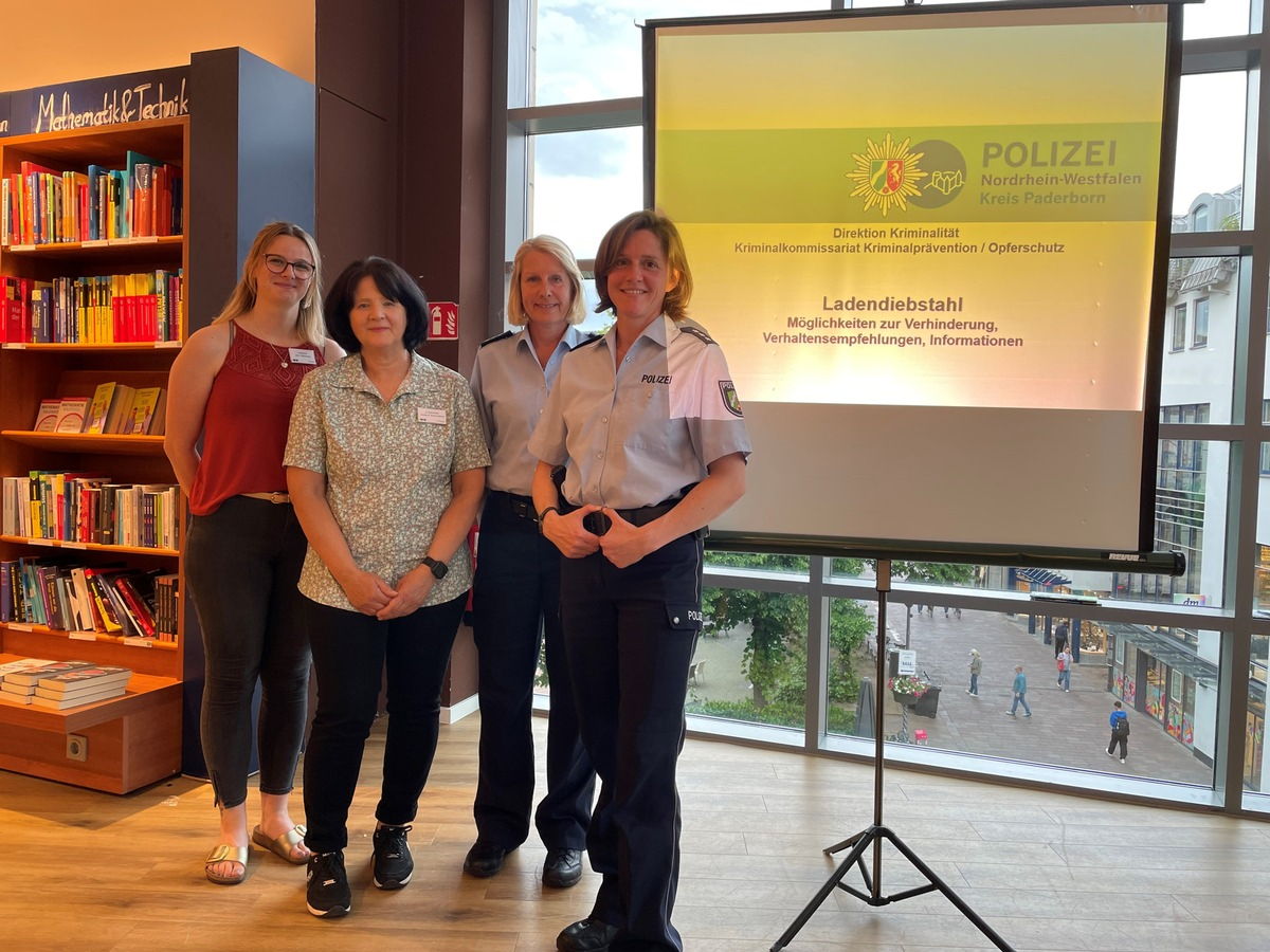 28.05.2024 - 08:21:14 | presseportal.deAm 27. Mai schulten Monika Freff und Simone Höing, Kriminalhauptkommissarinnen des Kriminalkommissariat PrĂ€vention/ Opferschutz bei der Kreispolizeibehörde Paderborn, Mitarbeitende der Buchhandlung Thalia in der WesternstraĂe Paderborn zum Thema. Eingeladen worden waren die beiden von der Filialleitung, Anke Maurischat.