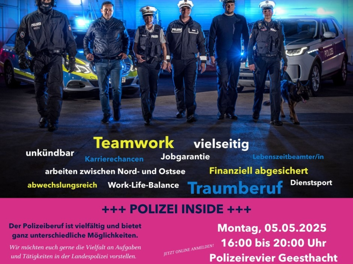 Sofern wir eurer Interesse geweckt haben, dann schnell unter folgendem Link anmelden, denn die Plätze sind begrenzt: https://www.schleswig-holstein.de/DE/landesregierung/ministerien-behoerden/POLIZEI/Berufung/berufseinstieg/_documents/fachinhalte/polizei_inside_geesthacht