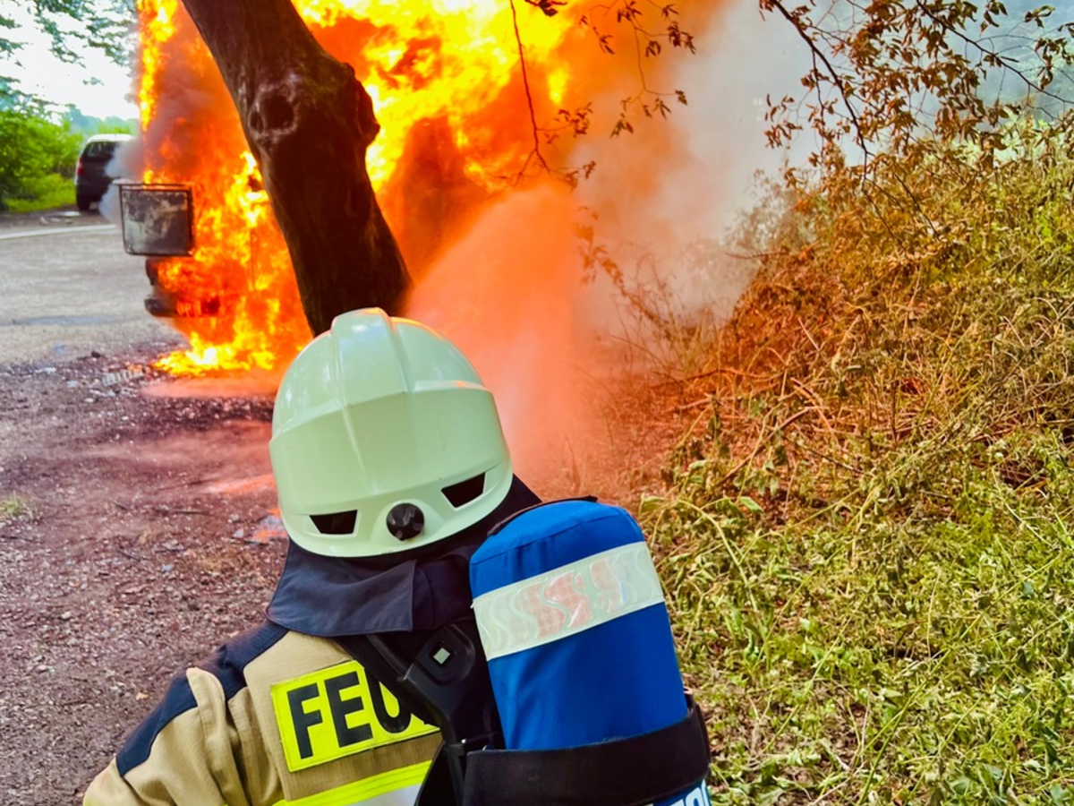 Rheurdt - Aufgrund eines PKW-Brandes wurde am Montagvormittag die Löscheinheit Schaephuysen zu einem Waldparkplatz an der Rayener Straße gerufen. Aus ungeklärter Ursache war ein dort geparkter, historischer Geländewagen des Typs PUCH G, der offenbar zu Camping-Zwecken umgebaut worden war, in Brand geraten. Das Feuer hatte bei Eintreffen der ersten Kräfte bereits auf Teile der angrenzenden Böschung übergegriffen. Die Feuerwehr verhinderte durch den Einsatz eines Löschrohres eine weitere Ausbreitung auf den Wald und brachte den Fahrzeugbrand rasch unter Gewalt. Zügig wurde der Innenraum des Campers kontrolliert, da zu diesem Zeitpunkt möglicherweise eingeschlossene Personen nicht ausgeschlossen werden konnten. Diese Überprüfung verlief glücklicherweise ohne Feststellung. Durch den schnellen, effektiven Einsatz der Löschmaßnahmen konnte der Brand letztlich auf die Kabine des Fahrzeugs beschränkt und gelöscht werden. Nach etwa einer Stunde waren die letzten Glutnester erloschen. Der betroffene Fahrer wurde durch den Rettungsdienst gesichtet, konnte aber an der Einsatzstelle verbleiben. 15 ehrenamtliche Feuerwehrkamerad:innen aus Schaephuysen waren gut 90 Minuten im Einsatz.