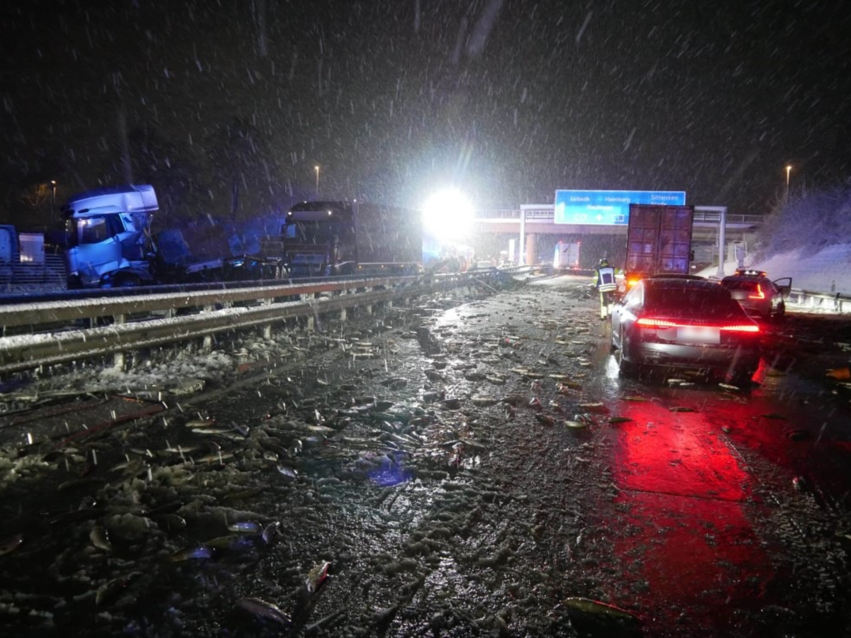 Ein nachfolgender 51-jähriger Lkw-Fahrer konnte nicht mehr rechtzeitig bremsen und fuhr in den querstehenden Sattelzug. Der Aufprall führte zu schweren Schäden am Auflieger, wodurch Hunderte von Fischen auf die Fahrbahnen beider Richtungen geschleudert wurden und verendeten. Der 51-Jährige blieb unverletzt. Die 57 Jahre alte Fahrerin des Fischtransporters und ihr 59 Jahre alter Beifahrer erlitten leichte Verletzungen.