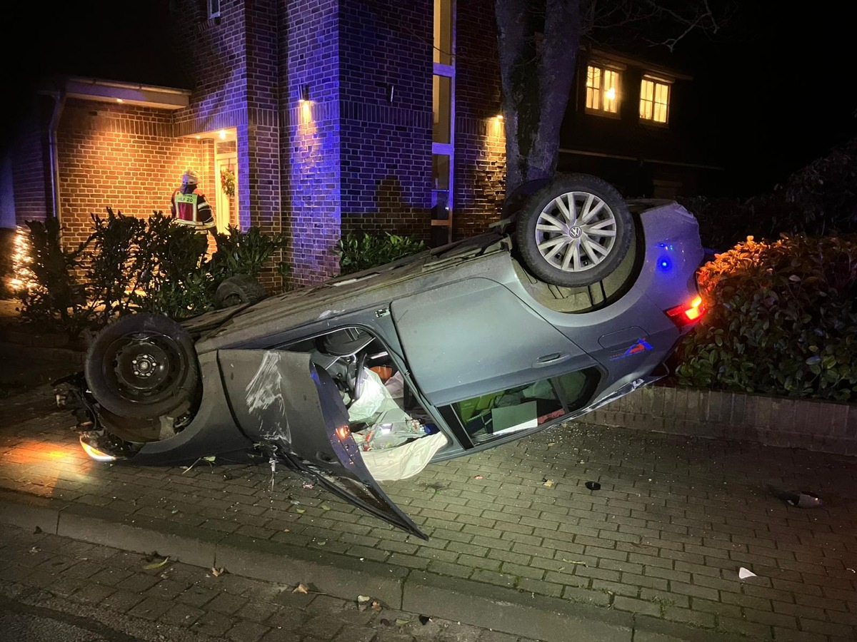Nach derzeitigem Stand der Ermittlungen befuhr ein 31-jähriger Mann aus dem Landkreis Stade mit vermutlich überhöhter Geschwindigkeit die Kivinanstraße. Beim Abbiegen an der Kreuzung nach rechts in die Bahnhofstraße, verlor er die Kontrolle über seinen VW Golf und prallte gegen die Bordsteinkante. In der Folge fuhr der Wagen über den Gehweg, kollidierte mit einer Mauer sowie einem Baum auf einem angrenzenden Grundstück und überschlug sich. Das Fahrzeug kam schließlich auf dem Dach zum Liegen.