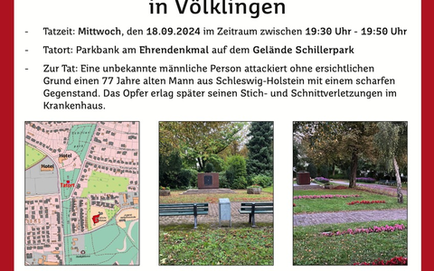 Nach bisherigen Erkenntnissen attackierte eine bislang unbekannte männliche Person ohne ersichtlichen Grund den 77 Jahre alten Mann aus Schleswig-Holstein mit einem scharfen Gegenstand. Das Opfer, das im Schillerpark auf einer Parkbank am Ehrendenkmal saß, erlag später den Stich- und Schnittverletzungen im Krankenhaus.