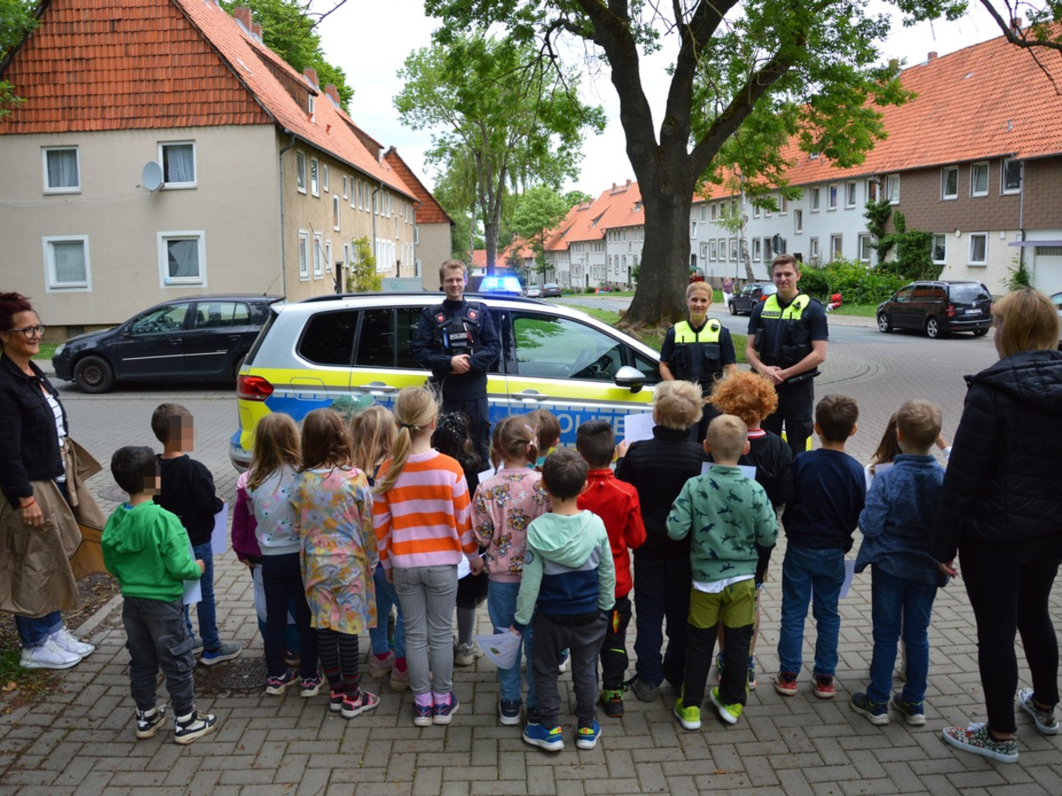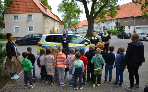 29.05.2024 - 11:04:12 | presseportal.deDie zuständigen Mitarbeitenden der Polizeistation Salzgitter-Gebhardshagen, William Chapman, Julia Aßmann und Jonas Borg (auf dem Foto v.l.n.r.) wurden heute früh von vielen aufgeregten Kindergartenkindern erwartet, die stolz ihren mehrfach geprobten, verkehrssicheren Ablauf des ab Sommer anstehenden Schulweges zur Grundschule Sonnenbergweg (Strecke: Kindergarten St. Gabriel - Sandgrubenweg - Am Fuchsloch - Sonnenbergweg - Grundschule Sonnenberg) prüfen lassen wollten.