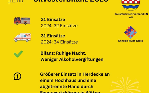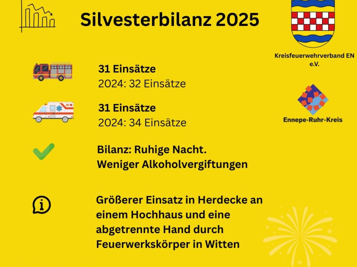 Der Rettungsdienst hatte es überwiegend mit typischen Silvestereinsätzen zu tun. Dazu zählten mehrere Einsätze aufgrund von Hand- und Gesichtsverletzungen durch Feuerwerkskörper. In einem besonders schweren Fall im Stadtgebiet Witten wurde einer Person durch einen Feuerwerkskörper eine Hand vom Arm abgetrennt.