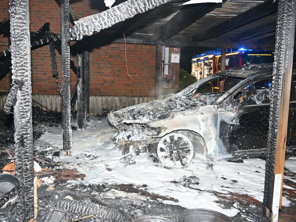 Carport zwischen zwei ReihenhĂ€usern in Stade ausgebrannt - PKW komplett zerstört - Sachschaden ca. 50.000 Euro, Zwei Transporter an der BundesstraĂe 73 in Ovelgönne aufgebrochen