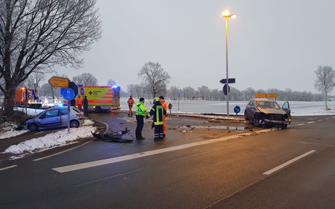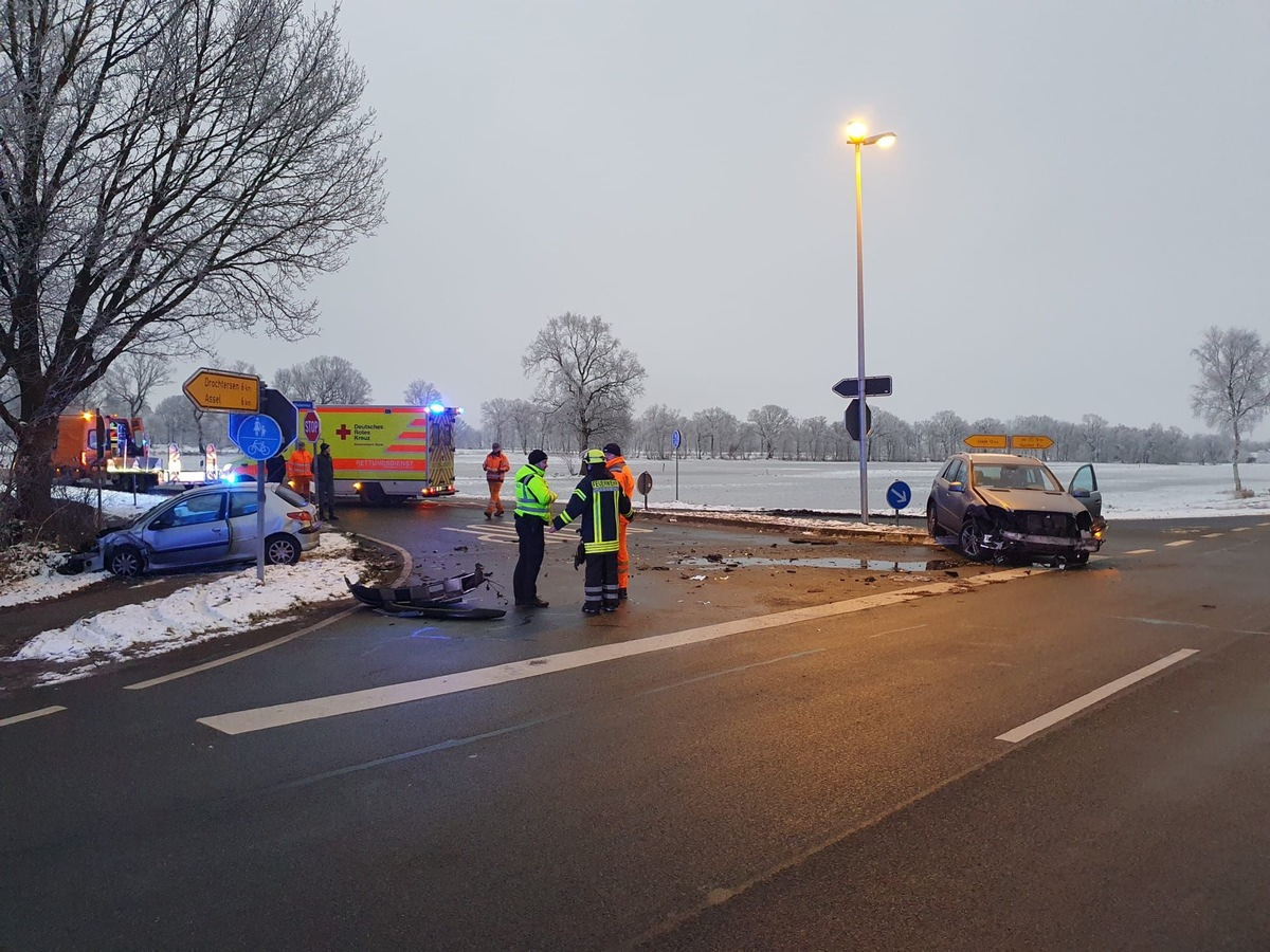 Am heutigen Vormittag gegen 08:00 h ist es in Ritschermoor auf einer dortigen Kreuzung zu einem Zusammenstoß von zwei Autos gekommen, bei dem ein Autofahrer durch Glück nur leicht verletzt wurde. Zu der Zeit war eine 19-jährige Fahrerin einer Mercedes M-Klasse aus Stade auf der Ritschermoorstraße in Richtung Stade unterwegs und wollte die Kreuzung überqueren. Dabei missachtete sie vermutlich die Vorfahrt des aus Richtung Hammahermoor kommenden 44-jährigen Fahrers eines Peugeot 206 und beide Fahrzeug prallten im Kreuzungsbereich zusammen. Der 44-Jährige wurde bei dem Unfall leicht verletzt und nach der Erstversorgung durch den Stader Notarzt vom Rettungsdienst in Stader Elbeklinikum eingeliefert. Die 19-Jährige blieb unverletzt. Die Ortswehr Asselermoor rückte an der Unfallstelle an. Die Feuerwehrleute sicherten die Unfallfahrzeuge ab und unterstützten den Rettungsdienst. Die Straßenmeisterei übernahm die Reinigung der Fahrbahnen nach dem Abtransport der beiden schwer beschädigten Unfallfahrzeuge. Der Gesamtschaden wird auf ca. 20.000 Euro geschätzt.