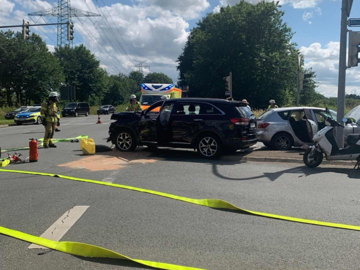 Die Staderin übersah den von rechts kommenden Mazda, so dass es zum ungebremsten Zusammenstoß der Fahrzeuge kam. Bei dem Aufprall erlitten im Mazda der Fahrer, seine Beifahrerin (25 J.) und zwei Kinder (2 Jahre, 7 Monate) leichte Verletzungen. Ein 4-jähriges Kind wurde jedoch schwer verletz. In dem Kia der Staderin erlitten sie selbst und ihr 22-jähriger Beifahrer leichte Verletzungen. Alle Personen wurden danach vom Rettungsdienst in ein Krankenhaus eingeliefert.