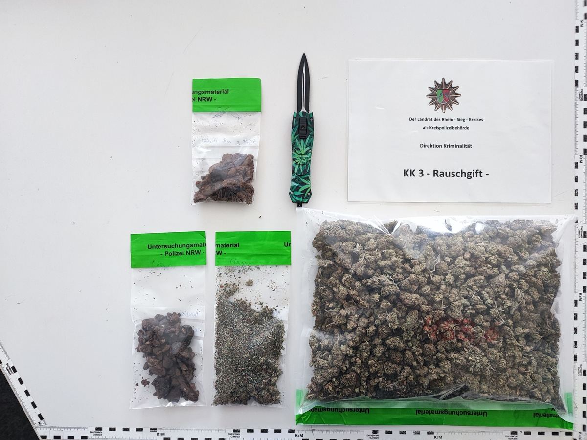 Siegburg - Am Montag (06. November) erhielten Beamte der Polizeiwache Siegburg gegen 00:10 Uhr den Hinweis auf ein verdächtiges Fahrzeug in der Humperdinckstraße in Siegburg. Das Auto sollte sich auf dem rückwärtigen Parkplatz eines Geldinstitutes befinden. Als die Polizisten an der Örtlichkeit ankamen, hielten sie einen VW Mietwagen an, der den genannten Parkplatz gerade verlassen wollte. Bei der Kontrolle des 34 Jahre alten Fahrers aus Hennef stellte sich heraus, dass er nicht der berechtigte Fahrzeugmieter war und auch nicht über eine Fahrerlaubnis verfügt. Zudem ergab ein Vortest, dass er unter dem Einfluss von Betäubungsmitteln stehen könnte. Polizisten brachten den Fahrer daher in ein Krankenhaus, um ihm eine Blutprobe entnehmen zu lassen. Ein ebenfalls 34-jähriger Beifahrer wurde vor Ort nach Personalienfeststellung entlassen. Weitere Polizeibeamte überprüften währenddessen den Mietwagen genauer und konnten eine Tasche mit ca. 100 Gramm Marihuana und einem Springmesser finden und stellten die Sachen sicher. Da nun der Verdacht des Handels mit Betäubungsmitteln mit Waffen bestand, wurde der Fahrzeugführer nach der Blutprobenentnahme vorläufig festgenommen und ins Polizeigewahrsam Siegburg gebracht. Ermittler des für Rauschgiftkriminalität zuständigen Kriminalkommissariats 3 der Polizei des Rhein-Sieg-Kreises durchsuchten am Morgen dann die Wohnung des Hennefers. Dabei konnten weitere circa 500 Gramm Marihuana und Haschisch aufgefunden werden. Nach Abschluss erkennungsdienstlicher Maßnahmen wurde der Tatverdächtige, der bislang noch nicht einschlägig in Erscheinung getreten war, mangels Haftgründen entlassen. Den Mann erwarten Anzeigen wegen Verstößen gegen das Betäubungsmittel- und gegen das Waffengesetz. (Uhl)