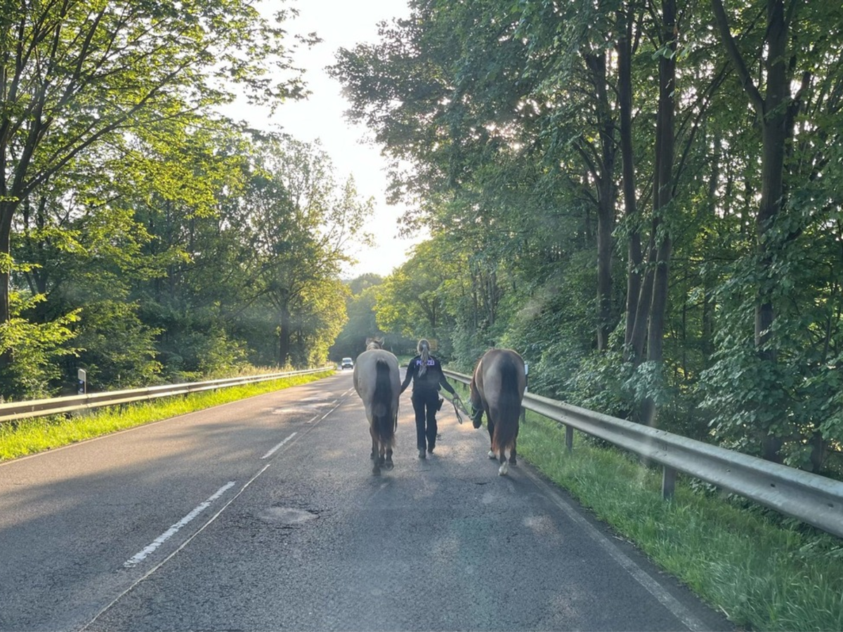 Windeck - Heute (29. Mai) sorgten in Windeck freilaufende Pferde für erhebliche Verkehrsbehinderungen auf der Kreisstraße 7 (K7). Gegen 06:30 Uhr erhielt die Polizei die Meldung, dass zwei Pferde auf der Fahrbahn der K7 in Höhe der Ortschaft Mauel gehen würden. Die Tiere ließen sich dabei vom morgendlichen Berufsverkehr offenbar nicht aus der Ruhe bringen und zogen die Hauptverkehrsstraße den umliegenden Feld- und Reitwegen vor. Polizisten der Wache Eitorf näherten sich den Tieren vorsichtig. Nach kurzem Anfreunden wurden die kooperativen Tiere an der nächsten Möglichkeit von der Straße geführt und auf der Weide eines Anwohners sicher untergebracht. Die K7 musste, bis Pferde und Polizisten in Sicherheit waren, voll gesperrt werden. Neben der Verkehrsbehinderung kam es zu keinen weiteren Schäden. Im Nachhinein konnte ermittelt werden, dass die Tiere, die im Ort niemandem bekannt waren, wahrscheinlich in Nümbrecht (etwa 13 Kilometer Luftlinie entfernt) ausgebüxt sind. Der Besitzer kam sie etwa eine Stunde später abholen und brachte sie in ihr nun hoffentlich ausbruchsicheres Zuhause. (Uhl)