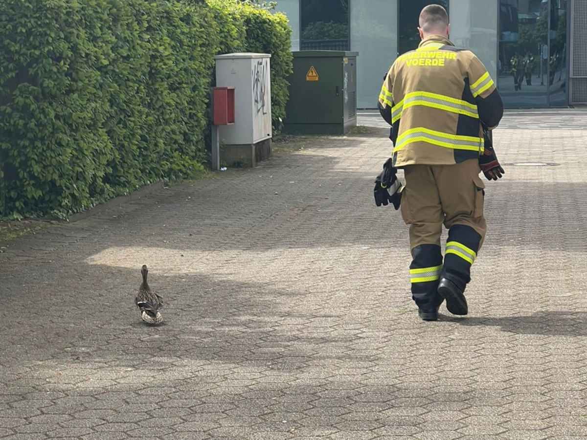 Voerde - Zu einem besonderen Rettungseinsatz wurde am Samstagmittag gegen 12:07 Uhr die Feuerwehreinheit Voerde gerufen. Frisch geschlüpfte Entenküken unternahmen ihren ersten Ausflug und landeten auf dem Dach eines Schreibwarengeschäfts am Alnwicker Ring Ecke Friedrichsfelder Str. Was war geschehen. Eine Entenmutter hatte ihr Nest auf einem Balkon im 4. Obergeschoss eines Mehrfamilienhauses gebaut und dort gebrütet. Heute waren die kleinen Küken geschlüpft. Vermutlich auf der Suche nach einem Ententeich fielen die Kleinen vom Balkon drei Etagen in die Tiefe und landeten auf dem Vordach des Schreibwarengeschäfts. Eine Anwohnerin hatte dies beobachtet und rief die Feuerwehr. Nach Rücksprache des Einsatzleiters mit dem Amtsarzt wurden die Entenküken vorsichtig in einen Korb gesetzt und zu Fuß von den Einsatzkräften zum ca. 1 KM entfernten Haus Voerde gebracht. Alles unter dem strengen Blick der Entenmutter, die den Transport ebenfalls zu Fuß begleitete. Nach der glücklichen Rettung ist der Wassergraben des Haus Voerde ab jetzt das neue Zuhause der kleinen Entenfamilie.