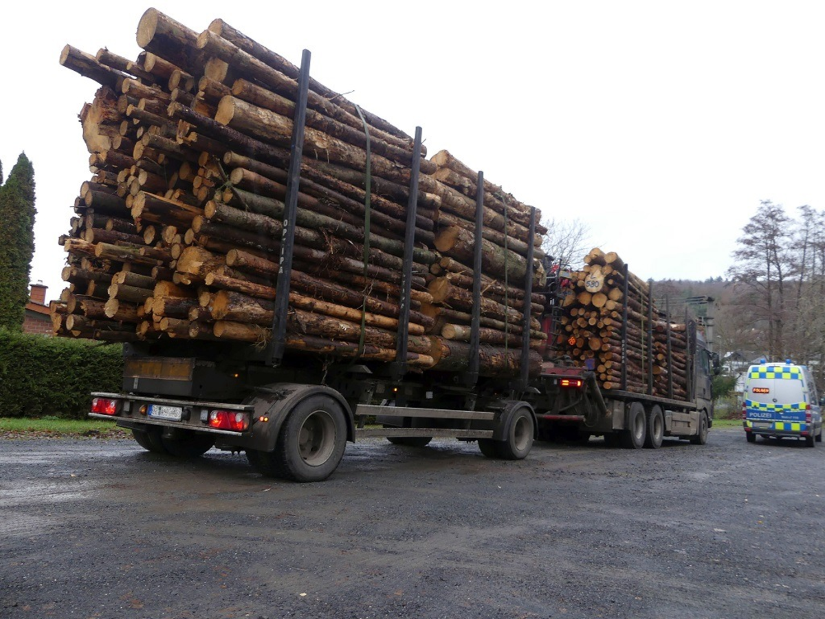 Viel zu schwer, deutlich zu hoch, Ladung zum Teil völlig ungesichert - Polizei stoppt Stammholztransport in Alsfeld-Eifa