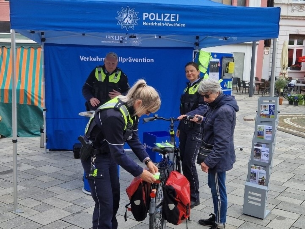 Im persönlichen Austausch mit den Interessierten, wurde der Unterschied zwischen Pedelec und E-Bike erläutert und auf die Wichtigkeit des Tragens eines Fahrradhelmes hingewiesen. Ergänzend stand die Erhöhung von Sicherheit im Straßenverkehr durch Sichtbarkeit im Fokus, vielfältige Möglichkeiten hierzu sind vorgestellt und veranschaulicht worden. Fragen gab es auch zur, nach Straßenverkehrsordnung vorgeschriebenen, Ausstattung eines Fahrrades und der daraus resultierenden, erhöhten Verkehrssicherheit des Zweirades.
