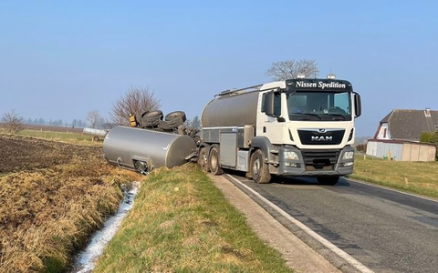 Der 45-jährige Fahrer eines Milchtanklasters war nach eigenen Angaben aus der Westerstraße nach links auf die L 1 in Richtung Medelby abgebogen, als ihm ein Sprinter mit Anhänger entgegenkam, der sehr weit links fuhr, so dass der 45-Jährige mit seinem LKW ausweichen musste, dabei auf die Bankette geriet und daraufhin der Anhänger seines Milchtanklasters nach rechts in den Graben kippte. Der andere Fahrzeugführer setzte seine Fahrt in Richtung Bramstedtlund fort, ohne sich um die Folgen des Unfalls zu kümmern. Der Fahrer des Milchlasters wurde glücklicherweise nicht verletzt. In dem Anhänger befanden sich 11000 Liter Milch, die durch den Unfall aus dem Milchtank in den Graben austraten. Es wurden diverse Freiwillige Feuerwehren und die Untere Wasserbehörde alarmiert. Der LKW konnte mittlerweile geborgen werden.