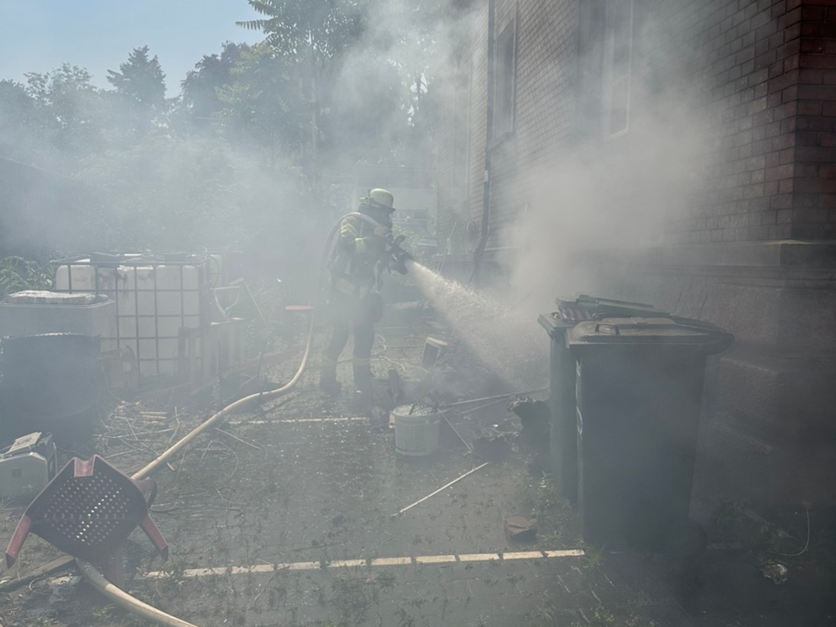 19.06.2025 - 16:03:11 | presseportal.deBeim Eintreffen der ersten Einsatzkräfte war die Polizei Weinhein bereits vor Ort. Anwohner hatten erste Löschversuche mit einem Gartenschlauch unternommen, mussten diese aber wegen des dichten Rauchs abbrechen. Der Brandherd befand sich im Außenbereich des Gebäudes. Hier standen dort abgestellter Unrat und Mülltonnen in Flammen. Der Rauch hatte sich bereits in das Gebäude ausgebreitet.
