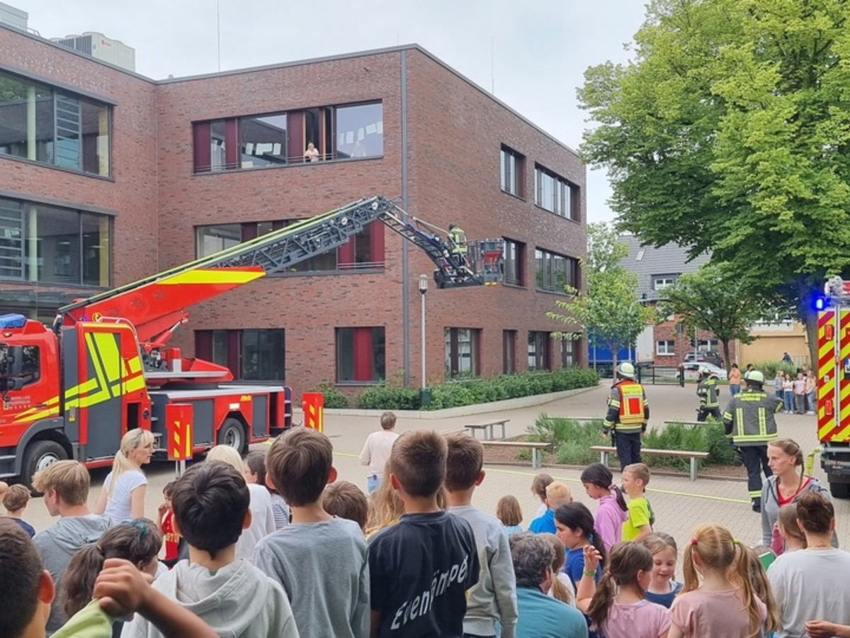 Werne - Mit Martinshorn und Blaulicht fuhren gegen 11 Uhr das Hilfeleistungslöschfahrzeug und die Drehleiter vom Löschzug 1 der Freiwilligen Feuerwehr Werne am Freitagmorgen den 21.06.2024 auf den Schulhof der Katholische Wiehagengrundschule an der Stockumer Straße. Während des Unterrichtes hatte der Feueralarm in den Schulen ausgelöst und Lehrkräfte wie auch Schüler mussten umgehend das jeweilige Klassenzimmer in Richtung der vorher definierten Sammelstellen verlassen. Zum Glück handelte es sich nur um eine Übung und nicht um ein echtes Feuer an der Schule! Elf Kameraden der Freiwilligen Feuerwehr Werne führten in der Katholische Wiehagengrundschule eine sogenannte Schulübung durch. Ziel dieser Übung für die Lehrkräfte und Schüler war es, dass Schulgebäude bzw. die Klassenräume sicher, geordnet und zügig zu verlassen. Auch die Brandschützer nutzten diese Übung, um sich mit der Örtlichkeit besser vertraut zu machen, damit es im Einsatzfall schnell geht. Wie bei den Brandschutzfrüherziehungen, die durch die Mitglieder der Freiwilligen Feuerwehr Werne für die 3. Klassen jedes Jahr abgehalten werden, sollten die Fenster der Klassenräume geschlossen und die Schüler in Zweierreihen das Gebäude ruhig verlassen. Dies gelang wieder hervorragend! Beim Zählen der Schüler an der Sammelstelle vergewisserte sich jede Lehrkraft, dass keiner Ihrer Schützlinge verloren ging. Jedoch eine Lehrerin hatte es nicht rechtzeitig geschafft sich vor den imaginären Flammen in Sicherheit zu bringen. Die Schulleiterin Nicola Buschkotte, winkte aus dem Fenster im dritten Stock und machte so die Brandschützer auf sich Aufmerksam. Ein Trupp unter Atemschutz ging parallel zu den Rettungsmaßnahmen der Drehleiter ins Gebäude vor und konnte das Feuer schnell finden und löschen. Zu Übungszwecken wurde Frau Buschkotte mittels Drehleiter aus Ihrer misslichen Lage gerettet. Dafür steuerte der Maschinist der Drehleiter den Korb in circa 10m Höhe so nah ans das Fenster das ein bündiges Einsteigen vom Fenster in den Korb möglich war. Sicher steuerte der Maschinist den Korb der Drehleiter in dem sich Ihre Lehrerin befand unter dem tobenden Applaus der Schülerschaft zu Boden. Die bereits perfekt positionierte Drehleiter wurde nach Abschluss der Übung direkt dazu benutzt, um diverse Bälle die ihr unfreiwilliges darsein auf den Abdächer gefunden hatten wieder zurück in den Spielbetrieb der Schüler zu geben. Viele Schüler schauten sich noch die Ausrüstung der Feuerwehr auf den Fahrzeugen im Detail an und stellten im Anschluss den freiwilligen Kräften unzählige Fragen, die nur ein Feuerwehrmann beantworten konnte. Den Mitgliedern der Freiwilligen Feuerwehr Werne und den Lehrern und Lehrerinnen hat diese gemeinsame Übung wieder einmal gezeigt, wie wichtig diese im Schulalltag ist. Die Wiehagengrundschule bedankte sich sehr herzlich bei der Freiwilligen Feuerwehr der Stadt Werne für dieses Engagement.