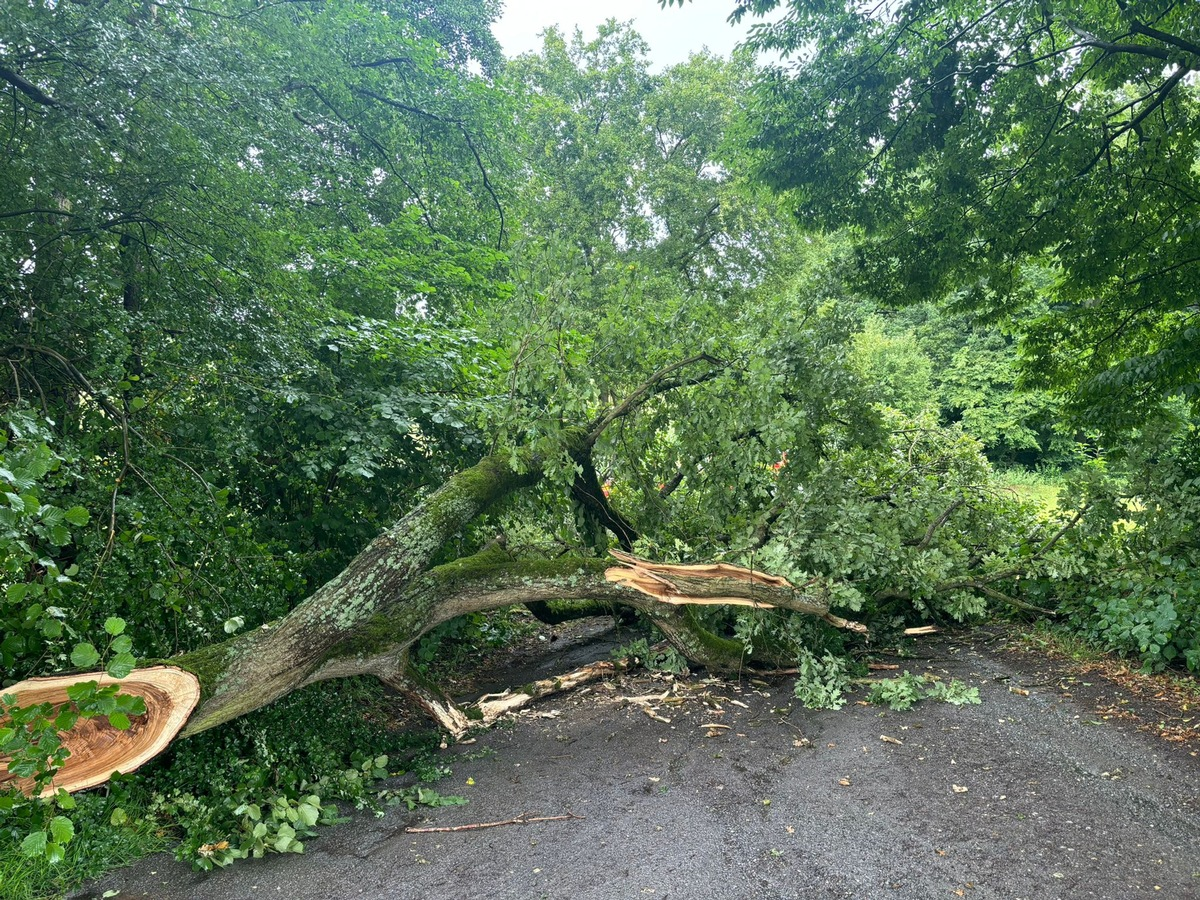 Wetter (Ruhr) - Die Löscheinheiten Grundschöttel und Esborn wurden am Freitag, 01.08.2025, um 15:25 Uhr zu einem umgestürzten Baum in der Straße "Horstbecke" alarmiert. Bei Eintreffen des Einsatzführungsdienstes konnte festgestellt werden, dass aus einer massiven Astgabelung einer Eiche ein Ast gebrochen war, welcher nunmehr die Fahrbahn blockierte. Ein weiterer Ast hing noch über der Fahrbahn und drohte ebenfalls herabzustürzen. Die Straße wurde durch die Einsatzkräfte gesperrt und der herabgestürzte Ast mit einer Motorsäge zerkleinert und beiseitegeräumt. Der weitere Ast wurde über die Drehleiter mithilfe einer Motorsäge abgetragen. Die Fahrbahn wurde anschließend noch gereinigt. Weitere Maßnahmen waren nicht erforderlich und der Einsatz konnte nach rund zwei Stunden beendet werden.