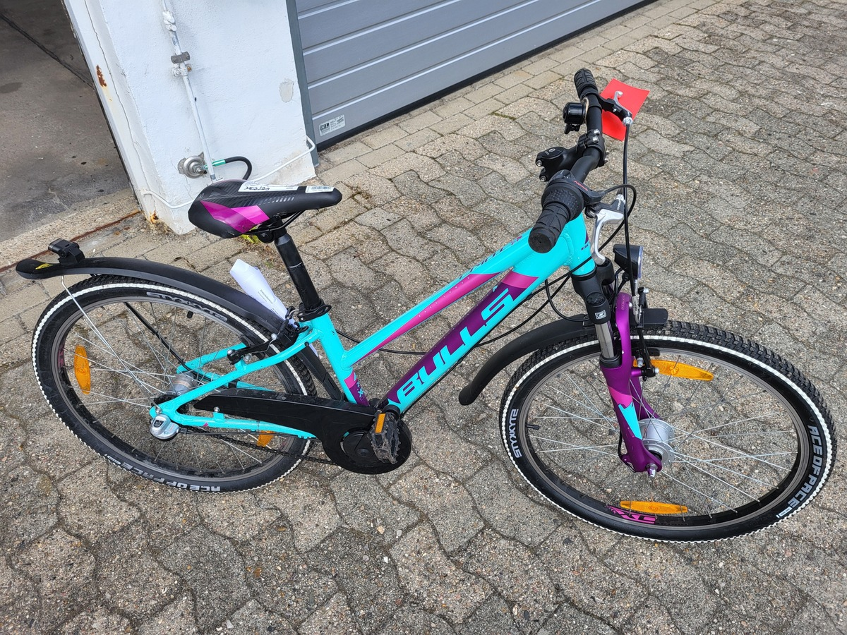 Es handelt sich um ein 24 Zoll Damenrad der Firma BULLS, Modell Tokee Street in der Farbe türkis, violett und pink, ein E-Bike der Firma BULLS, Modell Lacuba Evo Cross, ein E-Bike der Firma ICON.E, Modell IDesert X5 2.0 sowie ein E-Bike der Firma FISCHER, Modell ecu 1401.