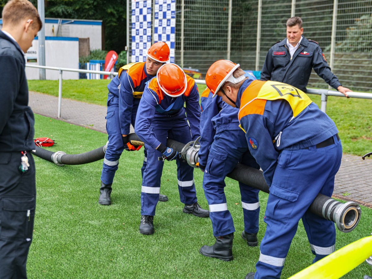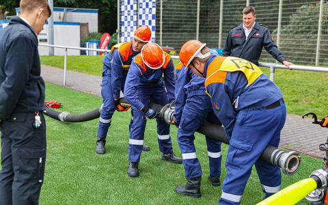Wuppertal - Rund 250 Jugendliche aus ganz NRW haben am Samstag (27.09.) in Wuppertal die Leistungsspange der Deutschen Jugendfeuerwehr errungen. In 26 Gruppen zeigten sie ihr Können in mehreren Disziplinen: Sie simulierten einen Löschangriff, machten eine Schnelligkeitsübung mit Feuerwehrgerät, absolvierten einen Theorietest und zeigten ihre Fitness beim Kugelstoßen und einem Staffellauf. Bei den Prüfungen steht Teamwork im Zentrum, die Jugendlichen absolvierten sie im Gruppenverbund. Die Leistungsspange ist die höchste Auszeichnung für die Mitglieder der Deutschen Jugendfeuerwehr. Schauplatz der Prüfungen waren der Sportplatz Freudenberg und der Uni-Campus in unmittelbarer Nähe. Die Gruppen kamen aus Ascheberg, Bottrop, Dormagen, Dortmund-Berghofen, Duisburg, Essen-Borbeck, Günne, Kempen, Monheim am Rhein, Münster, Niederzier, Remscheid, Rheurdt, Rommerskirchen, Solingen, Velbert, Voerde/Hünxe, Werne, Wetter, Willich und Wuppertal.