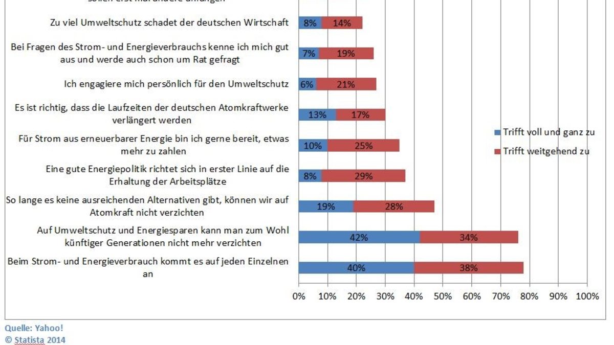 Eine Umfrage aus dem Jahr 2011 ergab, dass etwa 40 Prozent der Befragten es für wichtig halten, Strom und Energie zu sparen. Da Energiesparsamkeit mittlerweile aber nicht mehr nur mit dem Umweltschutz zusammenhängt, sondern auch mit den Kosten, die jeder einzelne für die verbrauchte Energie bezahlen muss, ist dies mittlerweile in vielen Haushalten zum Alltag geworden. Die Heizung wird beispielsweise nur so weit aufgedreht, dass der Raum eine Wohlfühltemperatur erreicht, aber nicht mehr überheizt ist. Die elektrischen Geräte sind bei Nichtgebrauch aus der Steckdose zu ziehen. Am sinnvollsten ist es, wenn beispielsweise eine Steckdosenleiste mit einem Power-Knopf angebracht wird. Beim Kauf von neuen Geräten sollten Kunden zudem auf die Energieeffizienzklasse achten, empfiehlt dieser Blog. Die Klasse A ist die energiesparsamste Variante. Nicht nur bei der Energie können Haushalte aber sparen. Wer zusätzlich noch Wasser spart, schützt die Umwelt noch ein bisschen mehr. Dies ist beispielsweise durch eine Spartaste an der Toilettenspülung möglich oder durch spezielle Duschköpfe, die Wasser vermischt mit Luft ausgeben - das Gefühl ist das Gleiche wie bei einem herkömmlichen Duschkopf, es wird aber weniger Wasser für einen Duschgang verbraucht. Vollbäder verbrauchen zudem etwa so viel Wasser wie zwei- bis dreimal Duschen - diese sollten also nur selten auf dem Tagesplan stehen. Wie sehr die Deutschen zu wichtigen Thesen aus den Bereichen Energie und Umwelt zustimmen, zeigt die folgende Statistik aus dem Jahre 2011: