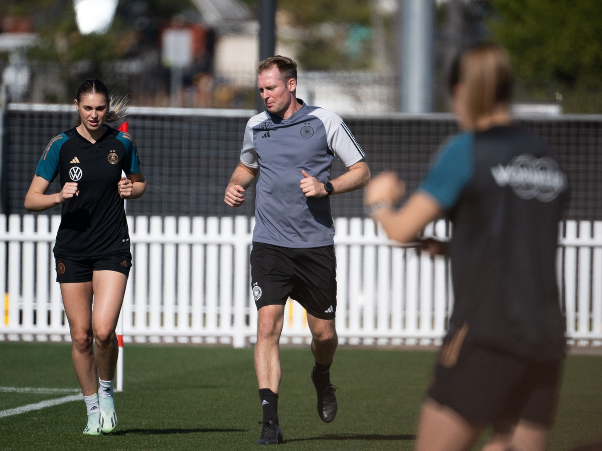 Jule Brand (l) trainiert am Rand des Trainingsplatzes. - Foto: Sebastian Christoph Gollnow/dpa