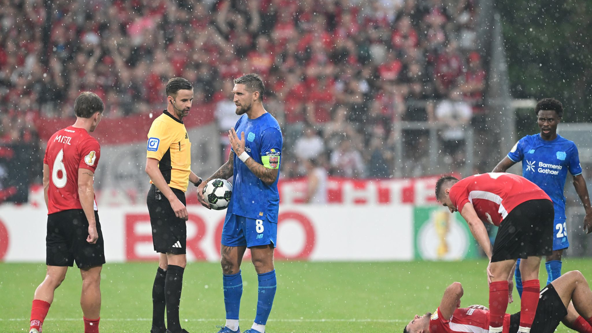 Beim Bayer-Auftritt schickte Schiedsrichter Michael Bacher beide Teams nach nicht einmal 20 Minuten wegen des Gewitters in die Kabine. Nach der Unterbrechung köpfte Torjäger Patrik Schick zur Führung ein (32.). Obwohl Großaspachs Kapitän Volkan Celiktas Gelb-Rot sah (66.), bekleckerte sich Leverkusen nicht mit Ruhm.